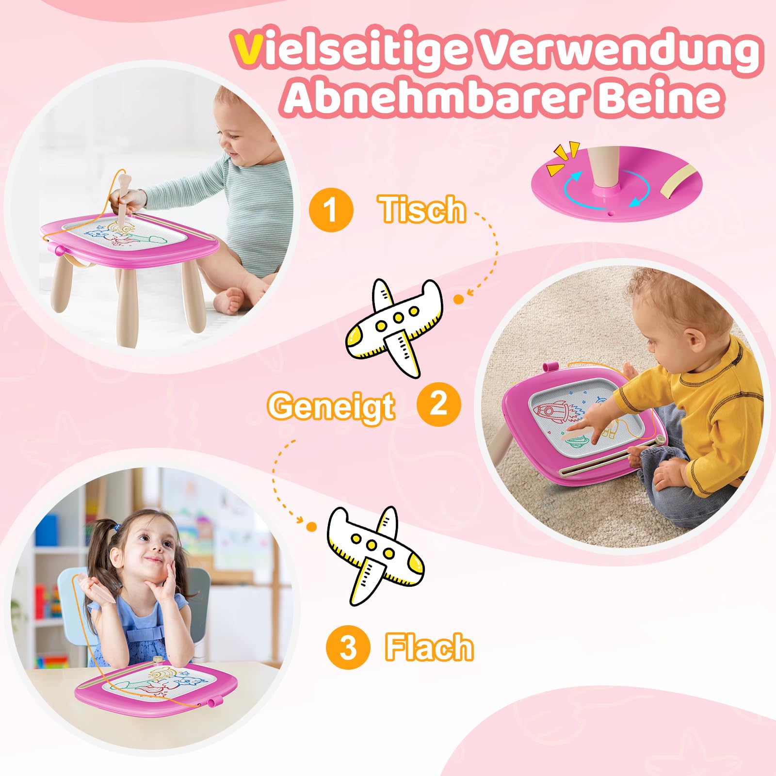 • Sturdy drawing table or doodle board: This drawing board is equipped with a durable screw system and high-quality legs that are designed for intensive use without wobbling or risk of breakage. Plus, the table's legs are easily removable and adjustable to three different heights, making them perfect for your little artist's comfort.