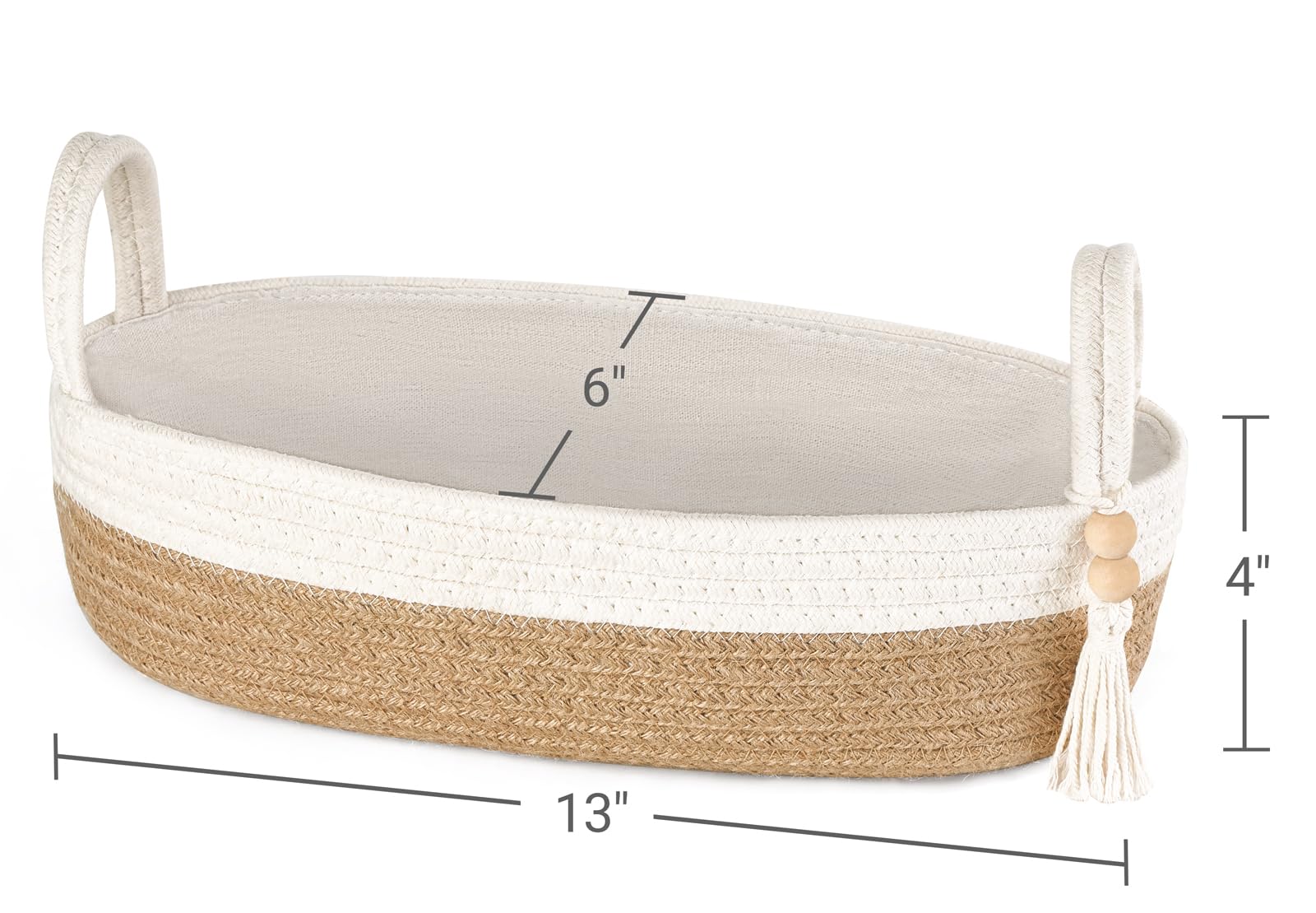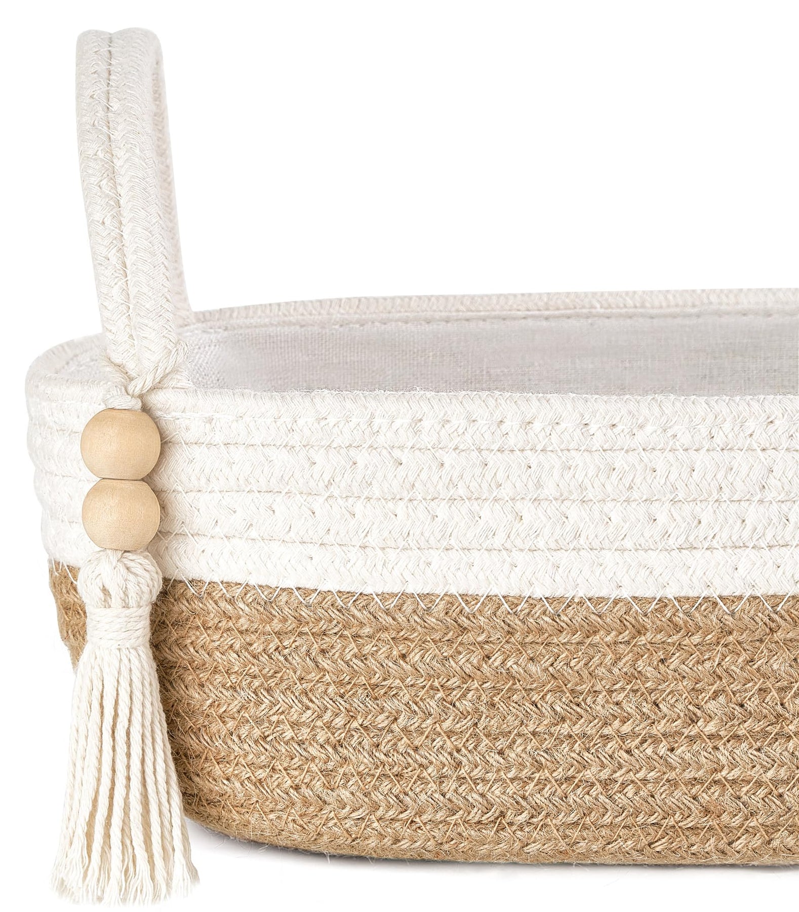 - Chic storage basket: This decorative storage basket is made of jute and cotton rope, and decoration with wooden bead fringes. The linen lining design prevents the cotton material from sticking to the object, cleaner and safer. Tips: The basket can be folded a little during shipping, you can first fill it with a towel or blanket for a few days, or iron it for return to its original shape.