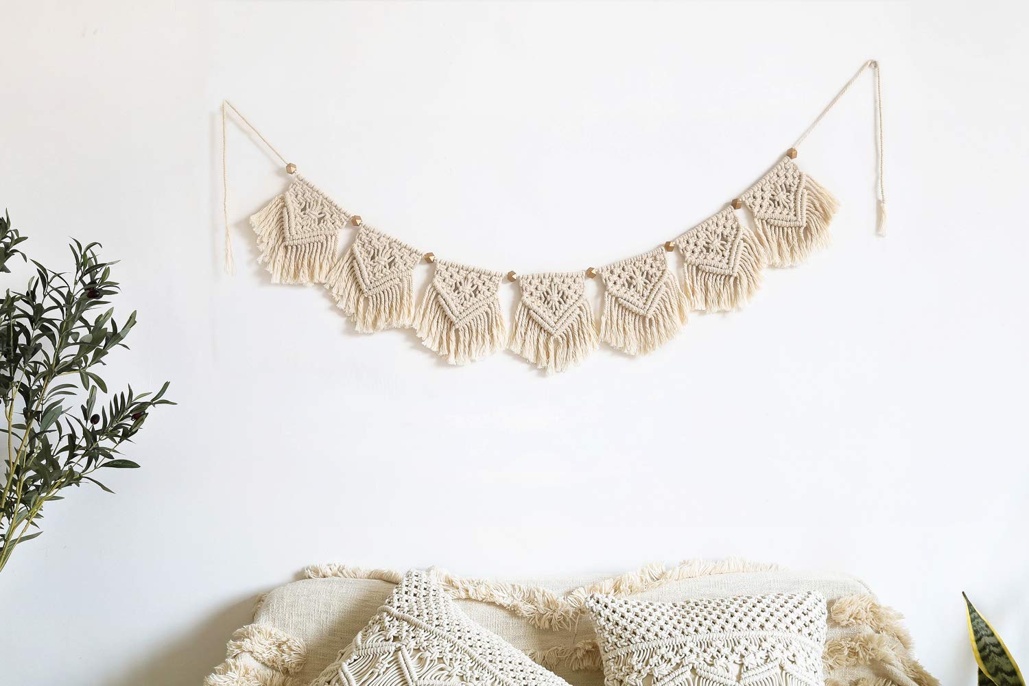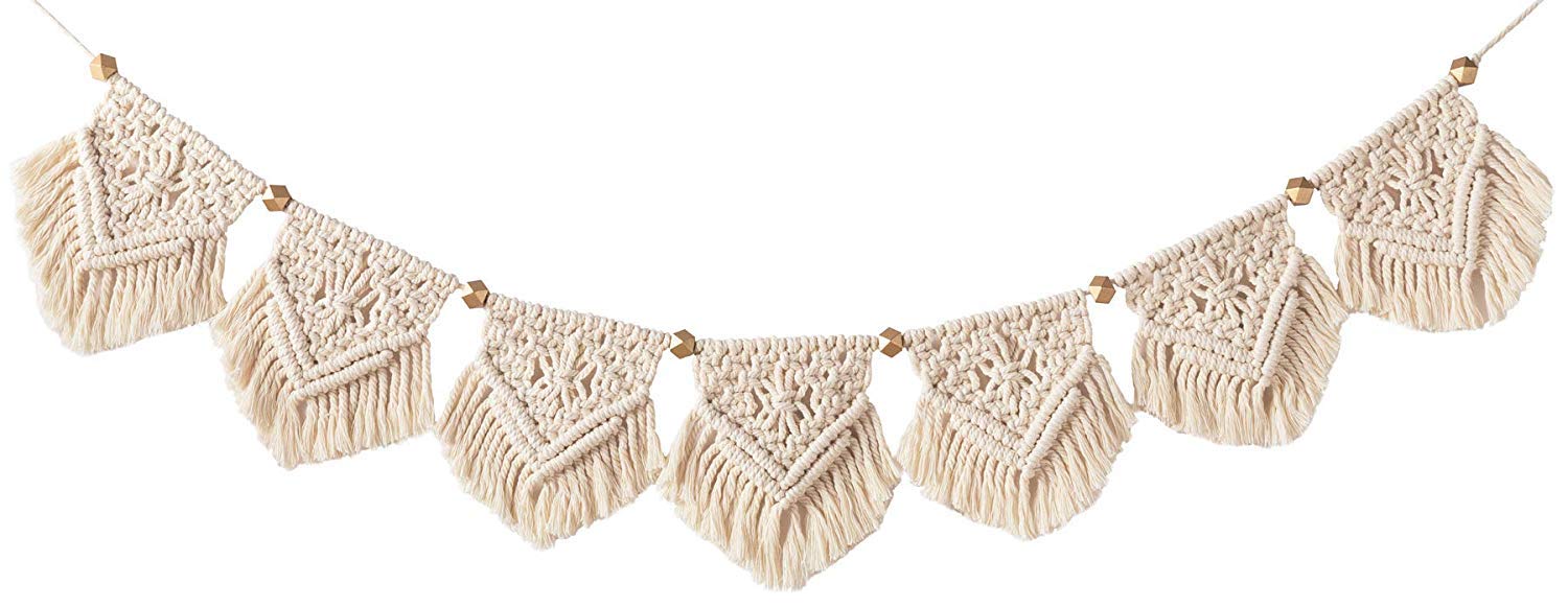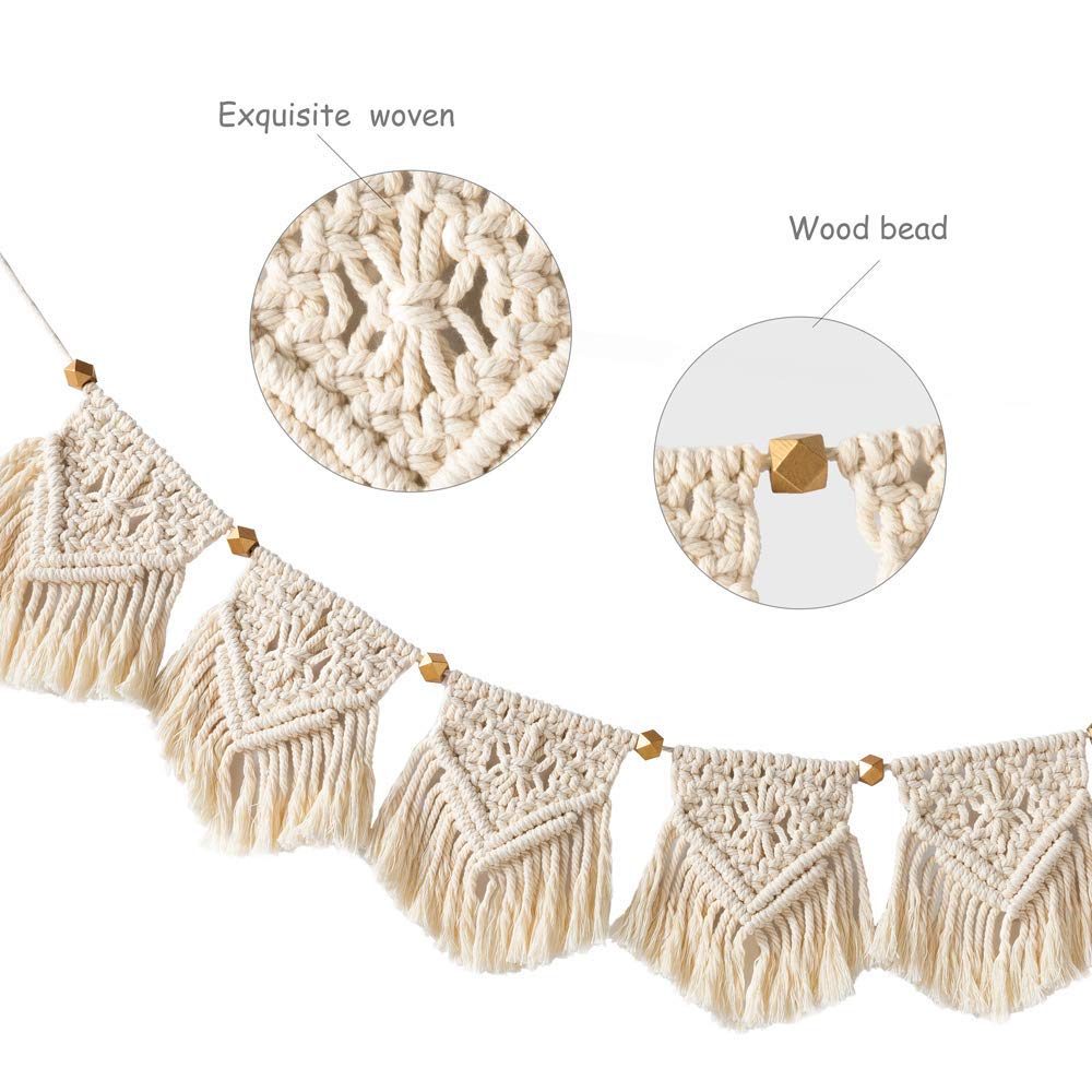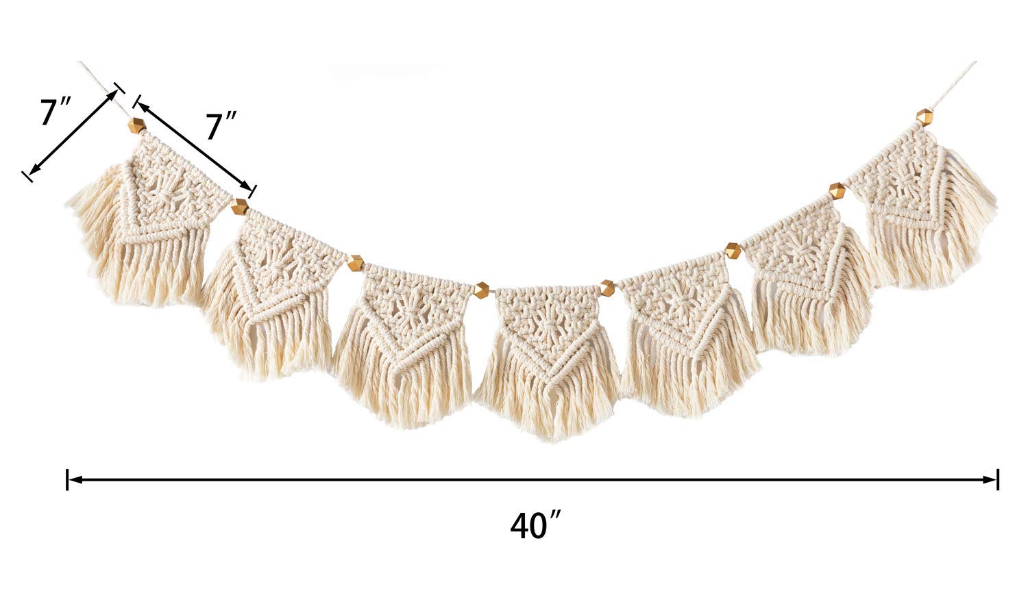 • Material: cotton and geometric wooden beads. The garland has 7 triangles, each triangle measures 7.5 inches in width. Total length measures 39.3 inches, and the distance between each triangle can be easily adjusted.