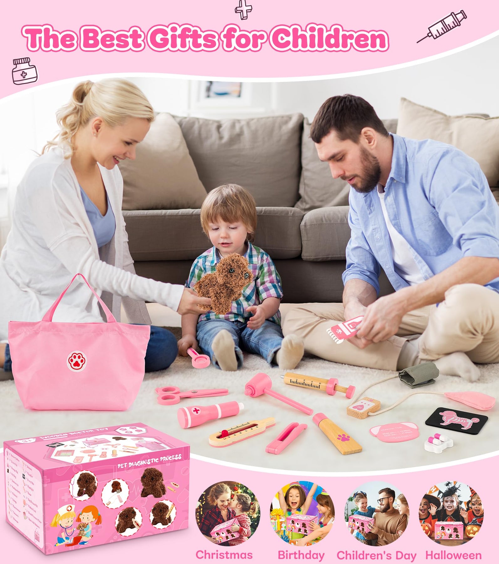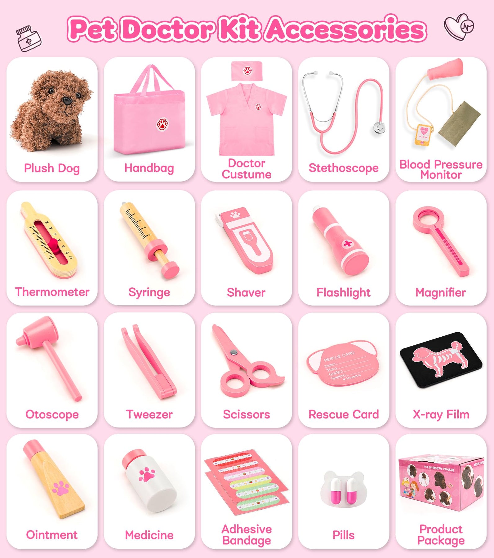 - Our vet playset is equipped with a highly realistic stethoscope, blood pressure monitor, syringe, thermometer and flashlight etc. Our children's doctor kit is made from high quality wood and guarantees both safety and durability. With smooth edges and no sharp parts, parents can have peace of mind while their children have a wonderful play experience