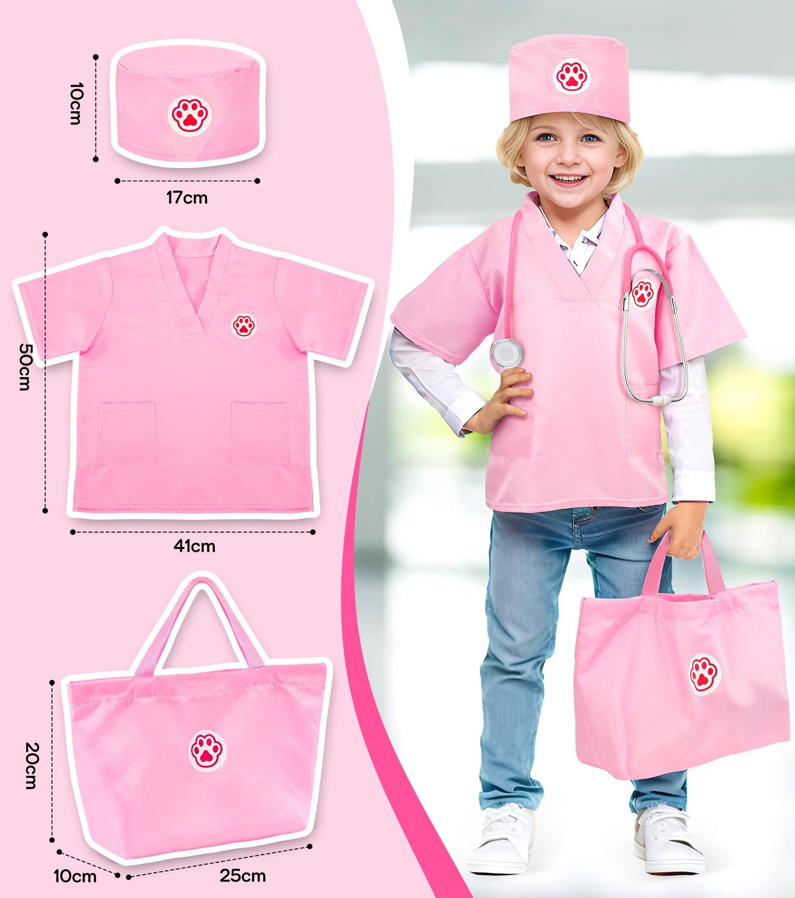 - By putting on the doctor costume, pretending to take a temperature, listen to the heartbeat and give the dog an injection, children learn how to care for pets or animals. It also gives children a great opportunity to use their active imagination, creativity and empathy. Ideal for boys and girls aged 3, 4, 5 and 6 at birthdays, parties, cosplay, Halloween,