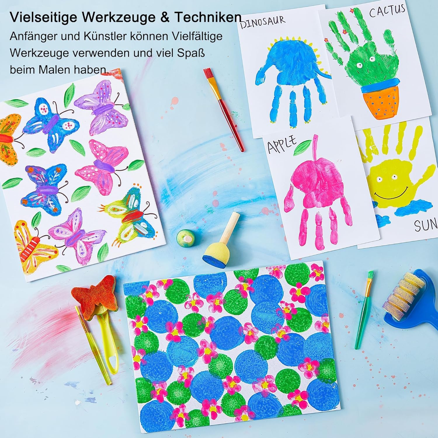 - We have prepared more than 30 pieces of painting tools and accessories in this set, including numerous finger painting stamps and brushes that children can start using as soon as they get the set. Other suitable painting tools such as sponge brushes and roller sponges give children more ideas for designing and playing. You can dive into it all day