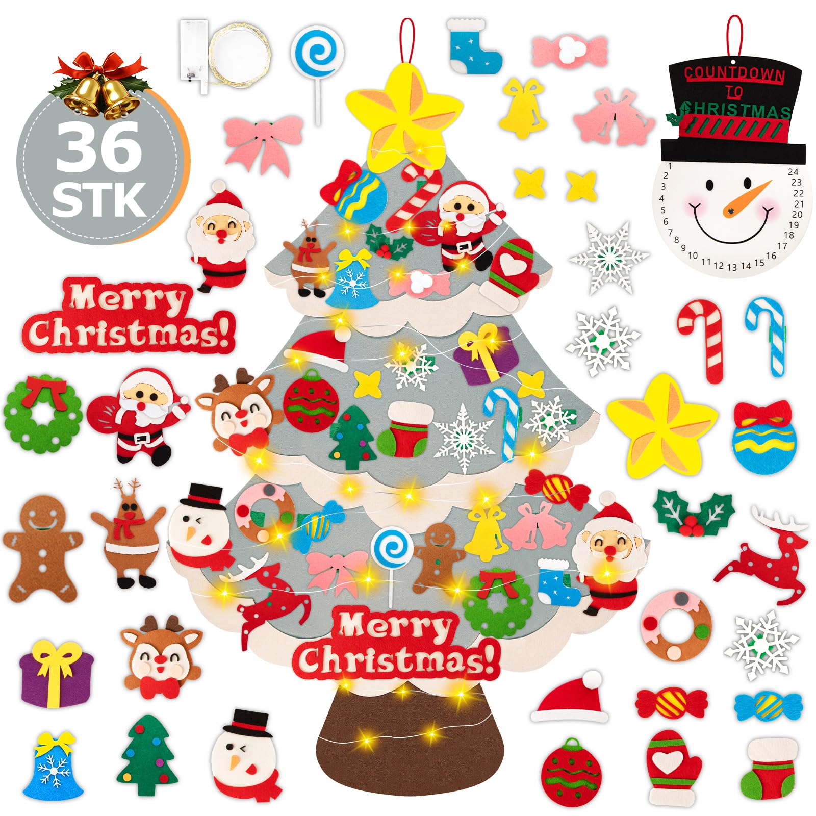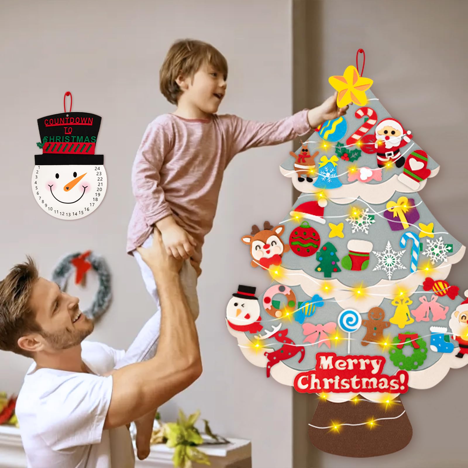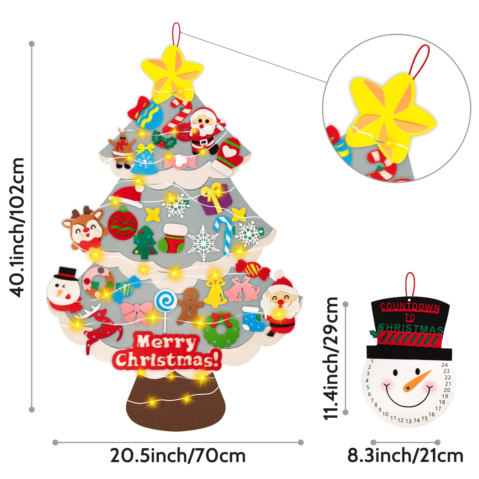 • Filz Weihnachtsbaum Kinderset: Filz Weihnachtsbaum inklusive 1 x blauem DIY Filz Weihnachtsbaum, 36 Stück abnehmbarer Christbaumschmuck, 1 x Schneemann Adventskalender und 1 x 200cm Lichterkette (Hinweis: Batterien nicht im Lieferumfang enthalten). Der Filzheizbaum für Kinder und Kleinkinder kann einfach an jede Oberfläche gehängt werden und verbessert die Fähigkeit Ihres Kindes, eine gute Weihnachtsdekoration für Ihre Tür, Ihr Zuhause, Ihre Wand usw. zu machen