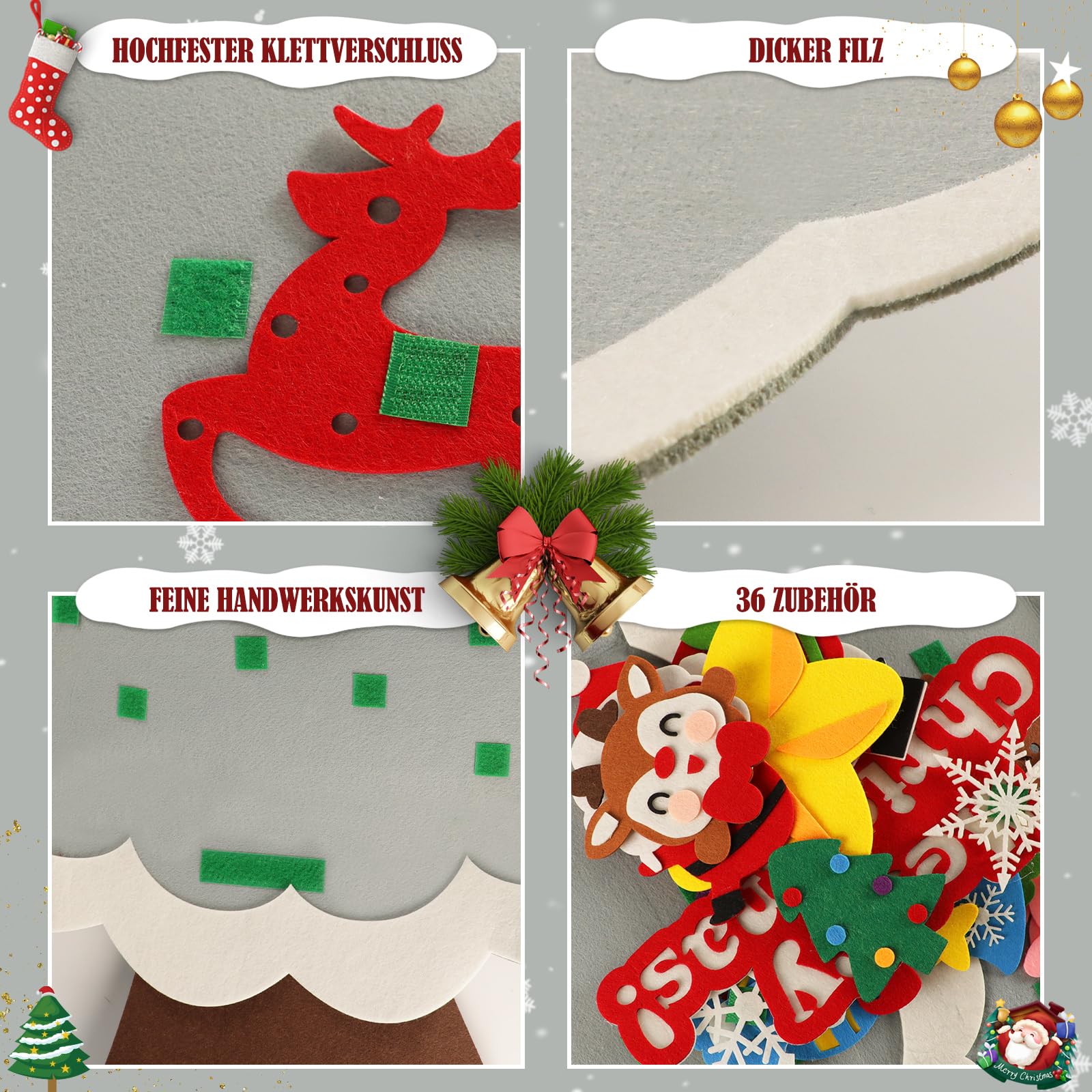 • 36 Abnehmbare Filz-Christbaumschmuck: Der Filz-Weihnachtsbaum für Kinder umfasst Weihnachtsmann, Schneemänner, Weihnachtsglocken, Schneeflocken, Schleifen, Hirsche, Süßigkeiten, Donuts, Weihnachtsmützen, Weihnachtssocken, Weihnachtshandschuhe, Elche, Weihnachtsbaum, gehäkelte Weihnachtsstechpalme, Lebkuchenmänner, Rudolph Rentier, Weihnachtsstöcke, a, frohe Weihnachten, Muster, eine Weihnachtsgeschenkbox, einen Windmühlenlutscher, einen Weihnachtskranz und mehr