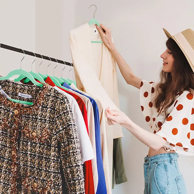 Rutschfeste Kleiderbügel aus Samt sind der perfekte Weg, um Ihre Kleidung an Ort und Stelle zu halten und optimal auszusehen. Unsere Kleiderbügel sind mit einer samtigen Oberfläche versehen, die ein Verrutschen und Knittern verhindert und gleichzeitig einen luxuriösen Look bietet. Mit ihrem schlanken Design passen sie perfekt in Ihren Kleiderschrank, ohne zu viel Platz zu beanspruchen.