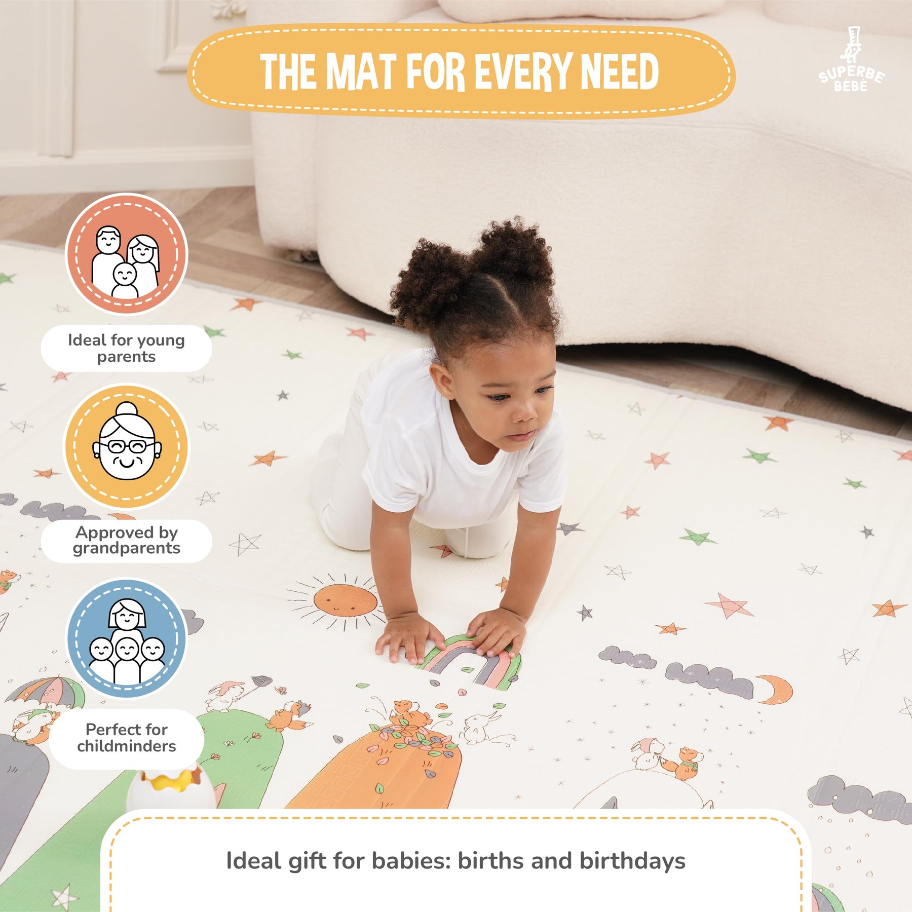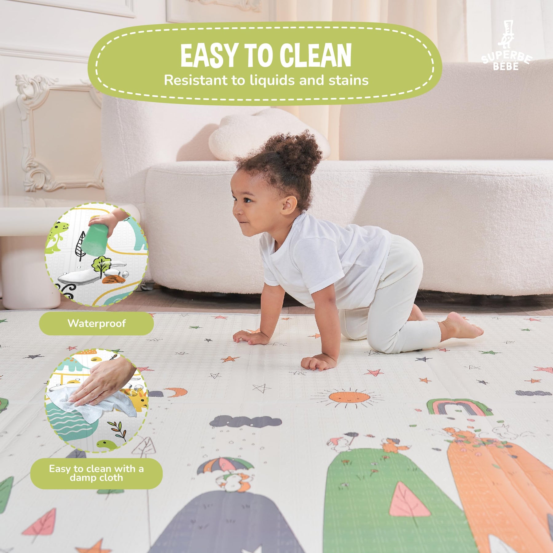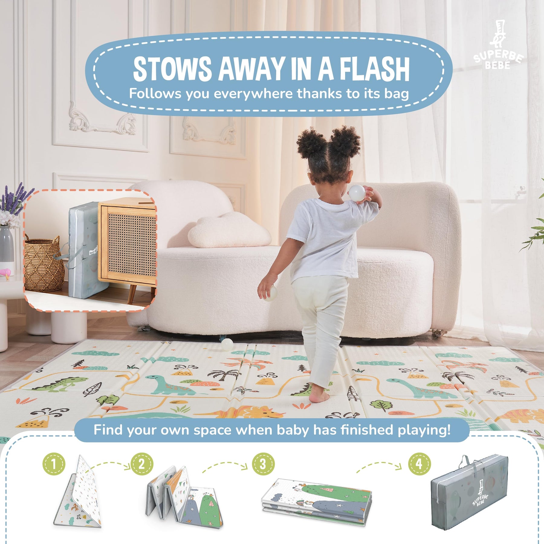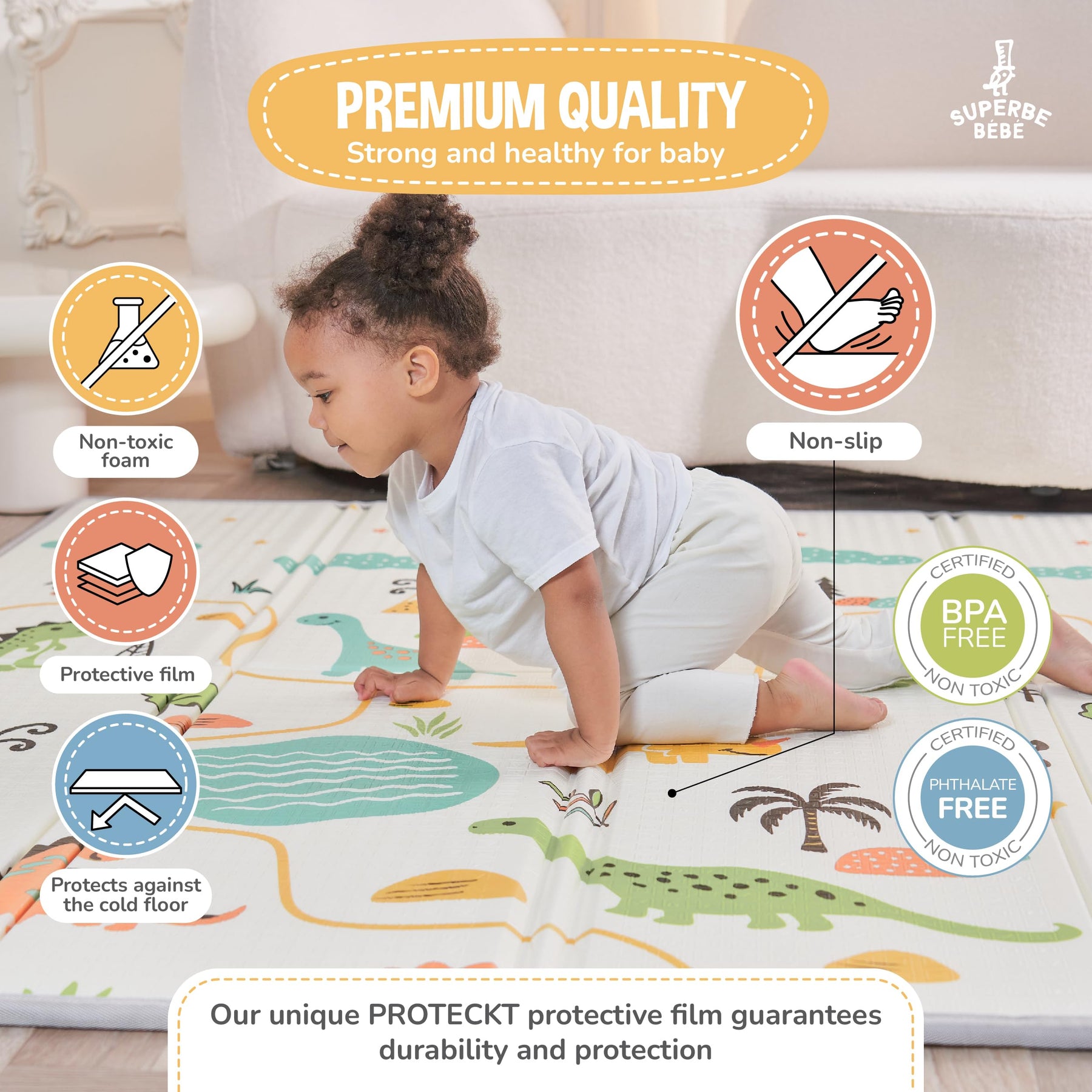 Ideal auf einem Laufstall, um Stürze abzufedern, wenn das Baby anfängt zu krabbeln und zu laufen. - Dank seiner rutschfesten Muster eignet sich unser Teppich perfekt zum Laufen lernen.
