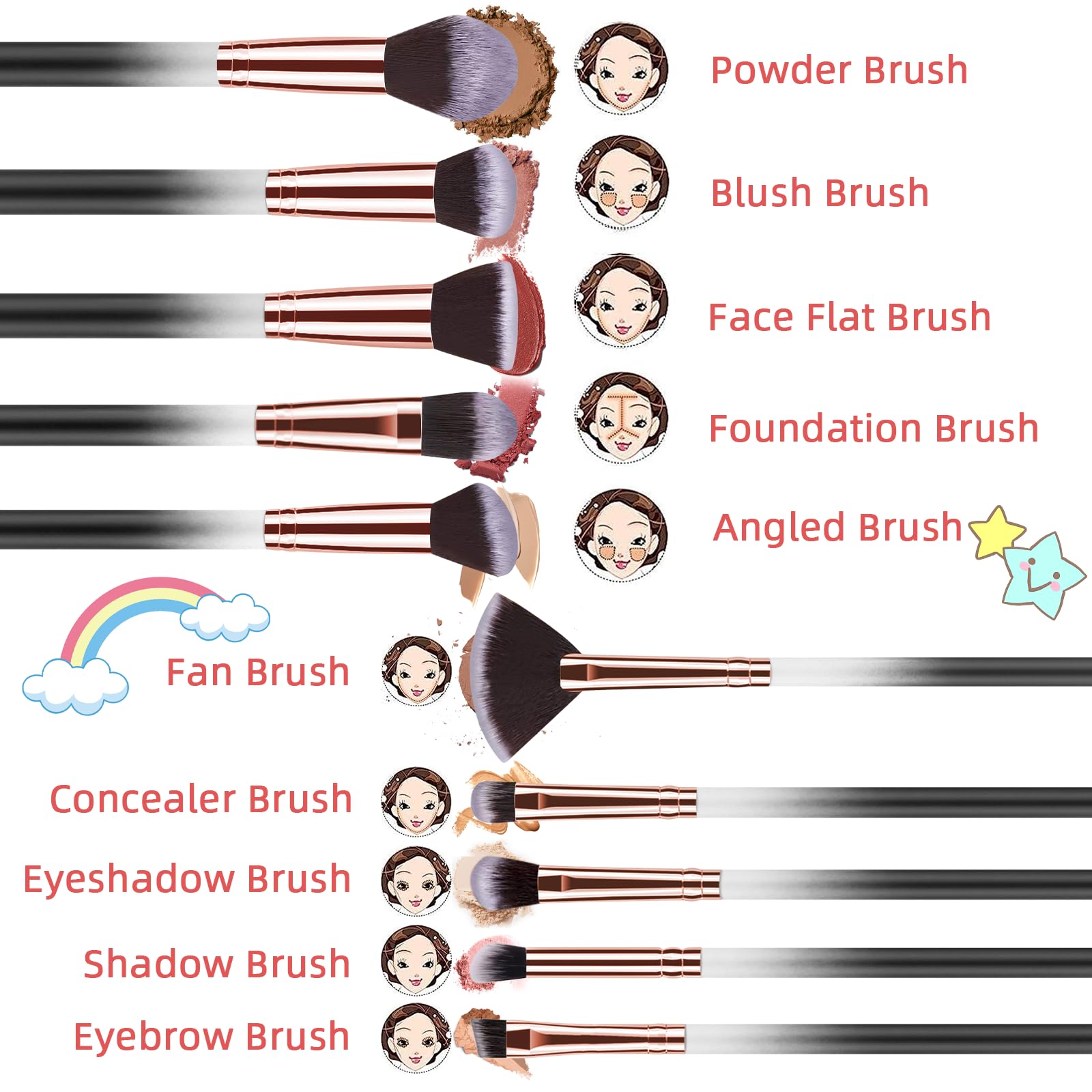 • 10PCS Makeup Brush Set: The 10pcs makeup brushes are a professional makeup brush set, including foundation brush, eyeshadow brush, concealer brush, eyeshadow brush, powder brush etc., can meet your daily makeup needs, perfect for makeup beginners and professionals.