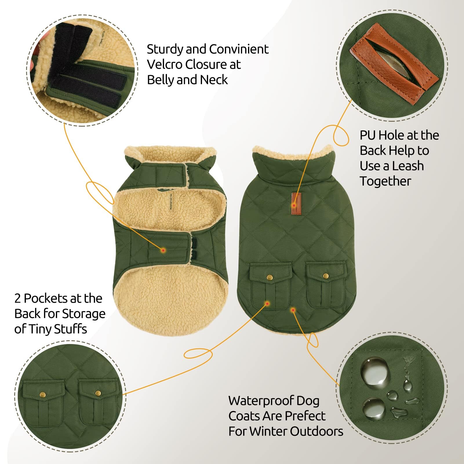 • Practical design with linen opening The winter coat dog has magic stickers on the belly and neck, which are convenient to wear. Steppe pockets provide space for treats or garbage bags. The fold-up collar also protects against wind.