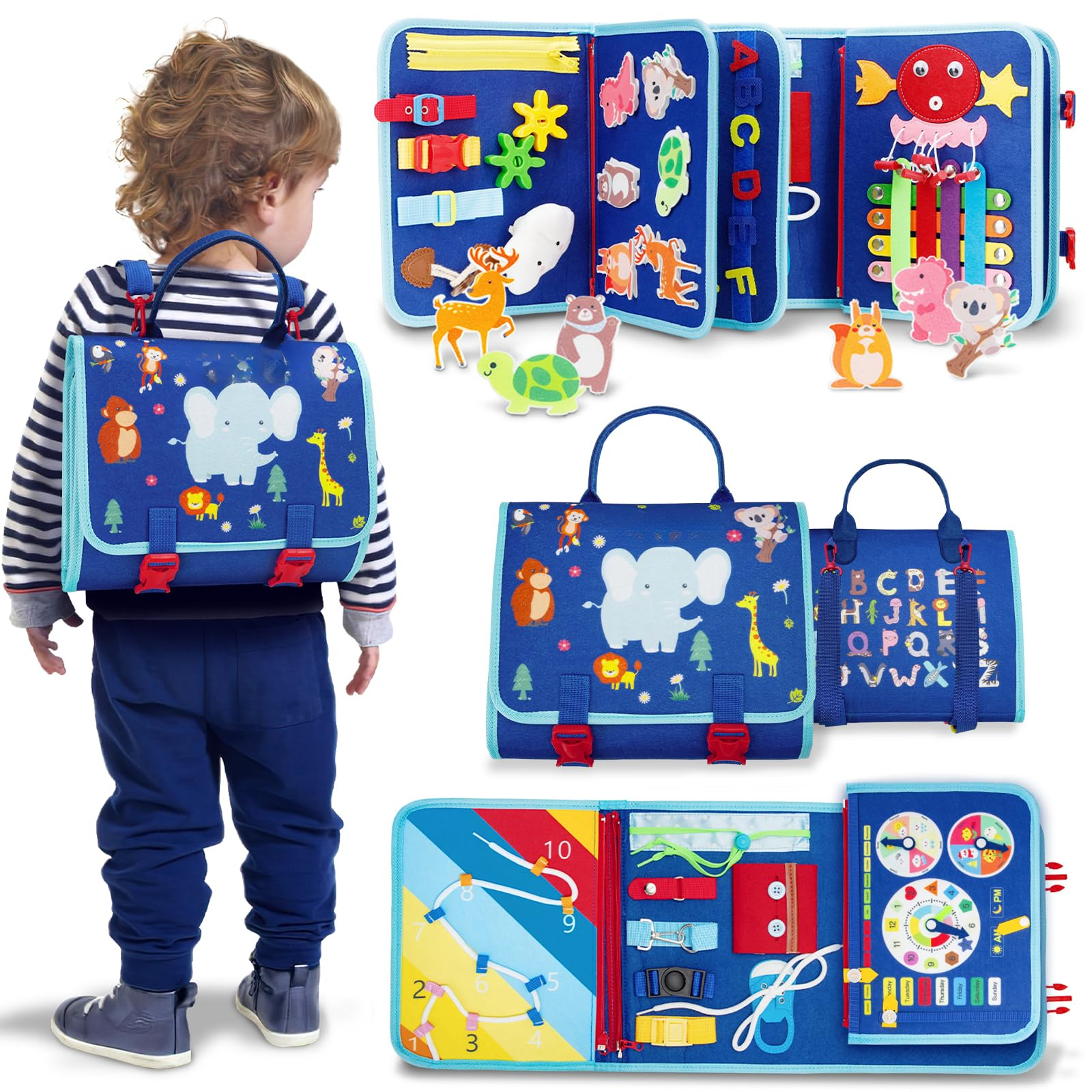 - 8-IN-1 Busy Board -busy board helps children to learn naturally through games. The design of this busy board has eight pages of content, with different levels of difficulty, but is not too big and interests your child, can keep him busy for a few hours. Including zippers, shoelaces, belts, buttons, clocks, calendars, shape matching, thread numbers, Velcro letters, animal pairings, etc.
