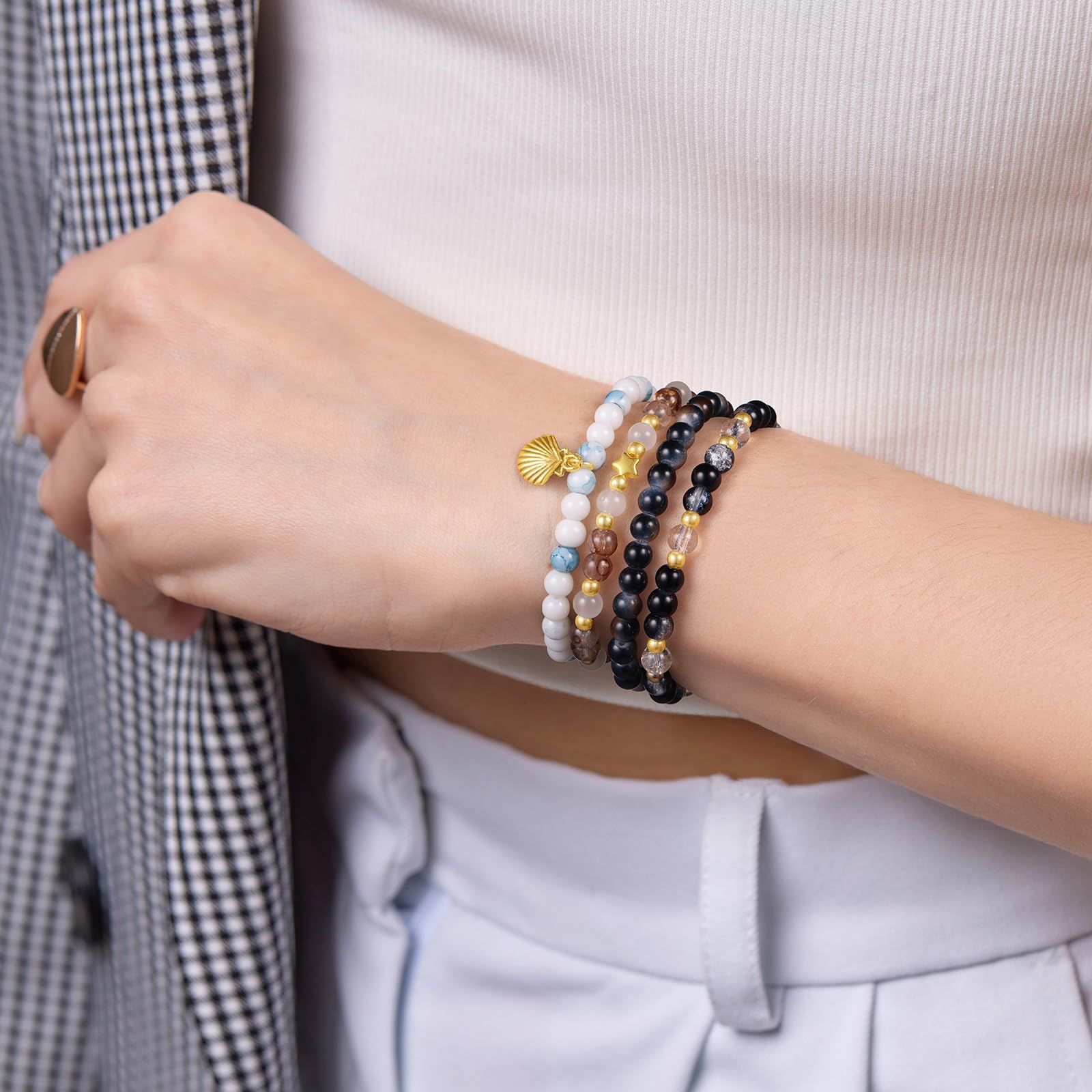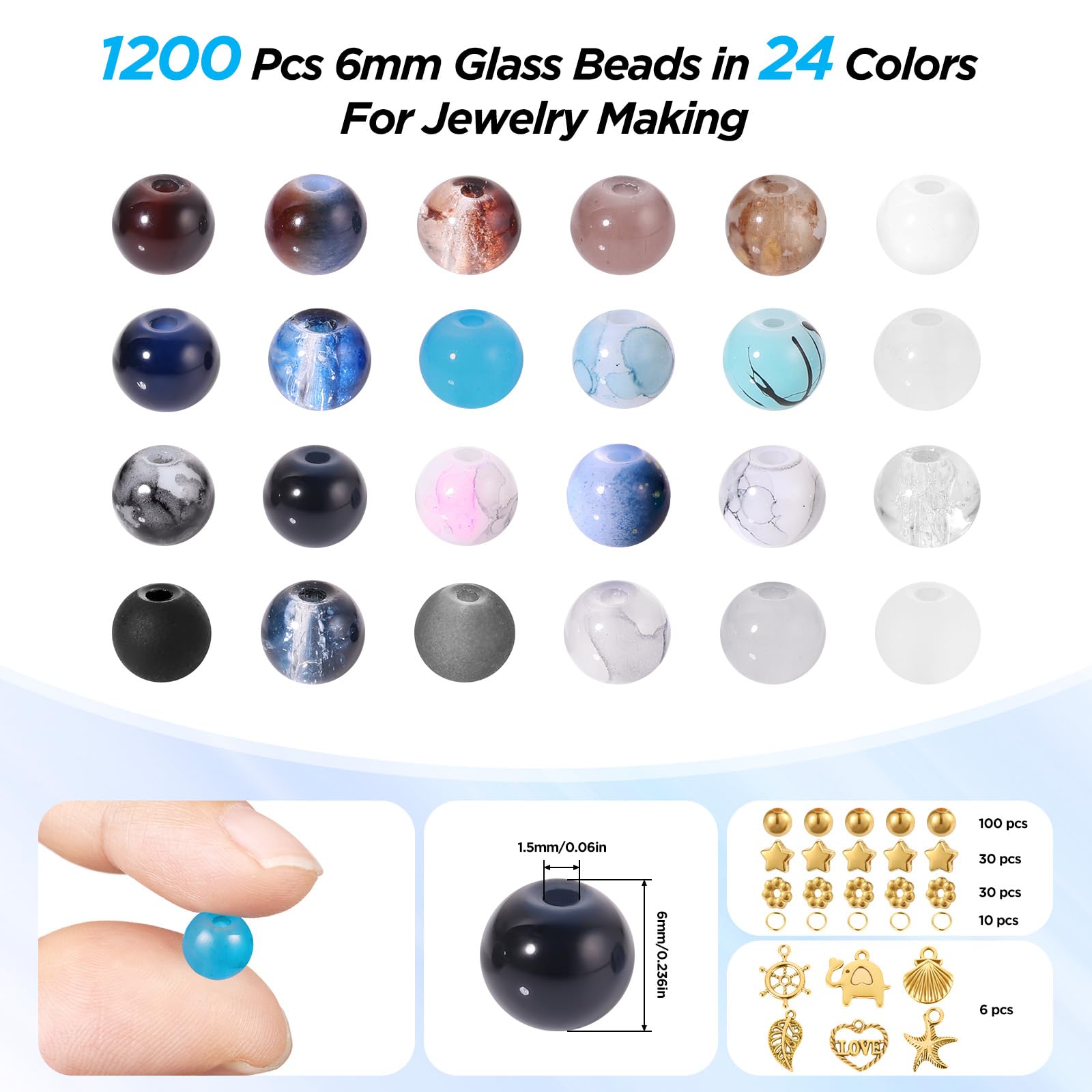 - Complete bead set bracelets: The set includes 1,200 pieces of 6mm glass beads (50 pieces each per color), 160 golden spacer beads, 6 golden pendants, 10 open jump rings and a roll of elastic band. The kit is delivered in a well-organized box, which provides separate compartments for each color, thus allowing easy storage, organization and transportation.