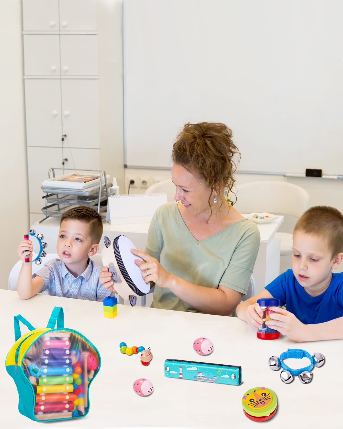 - 32 pieces of 18 kinds of rhythm instruments can provide children with different playing experiences, including shaking, tapping, beating and blowing. It is better for preschool children to start with music than drums. Easy to store and carry.(wooden toys from 3 years old)