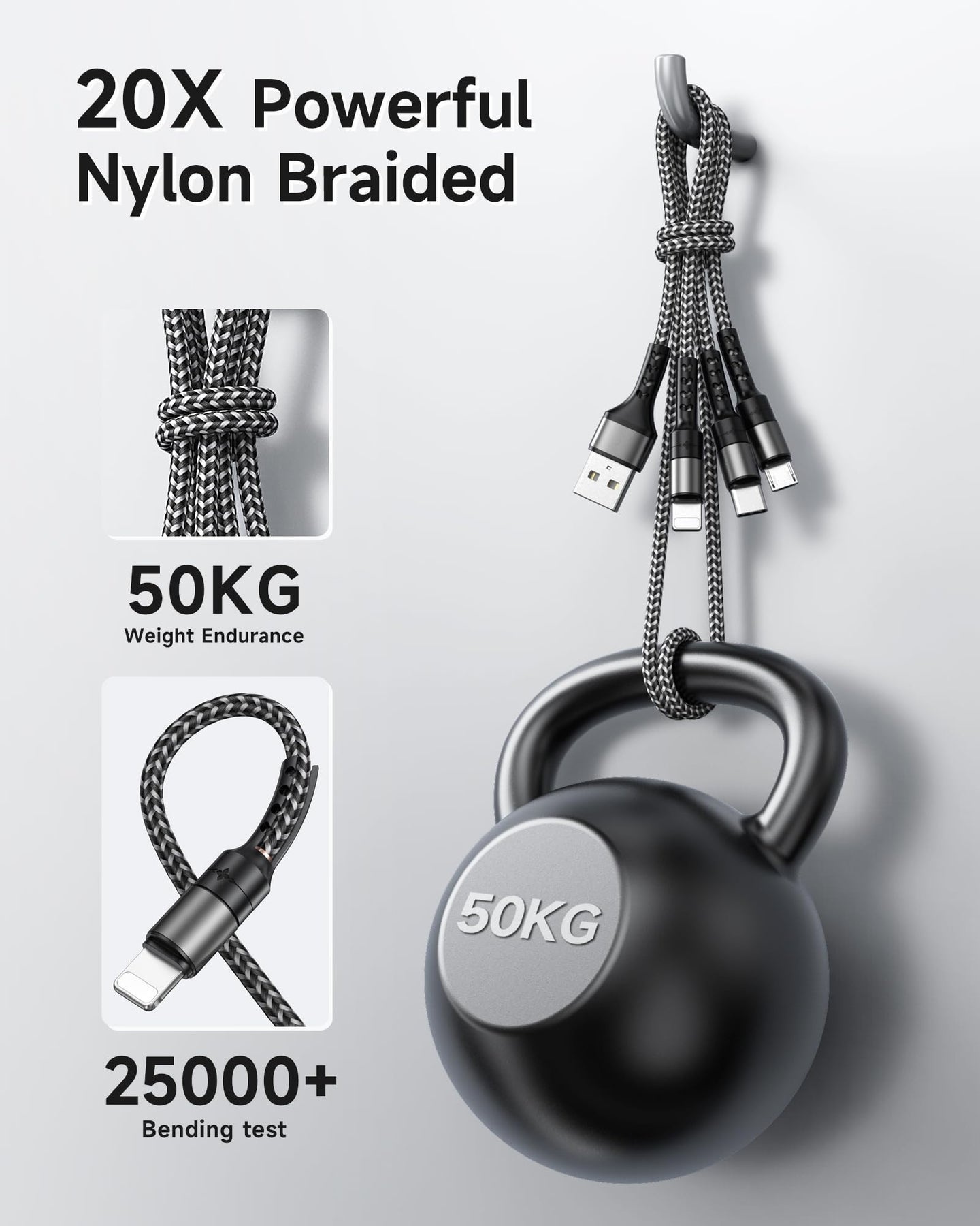 - The tangle-proof Multi USB charging cable braided with nylon withstood 10000+ bends in the test. The robust aluminum plug-in connection ensures a long service life and guarantees a perfect connection.