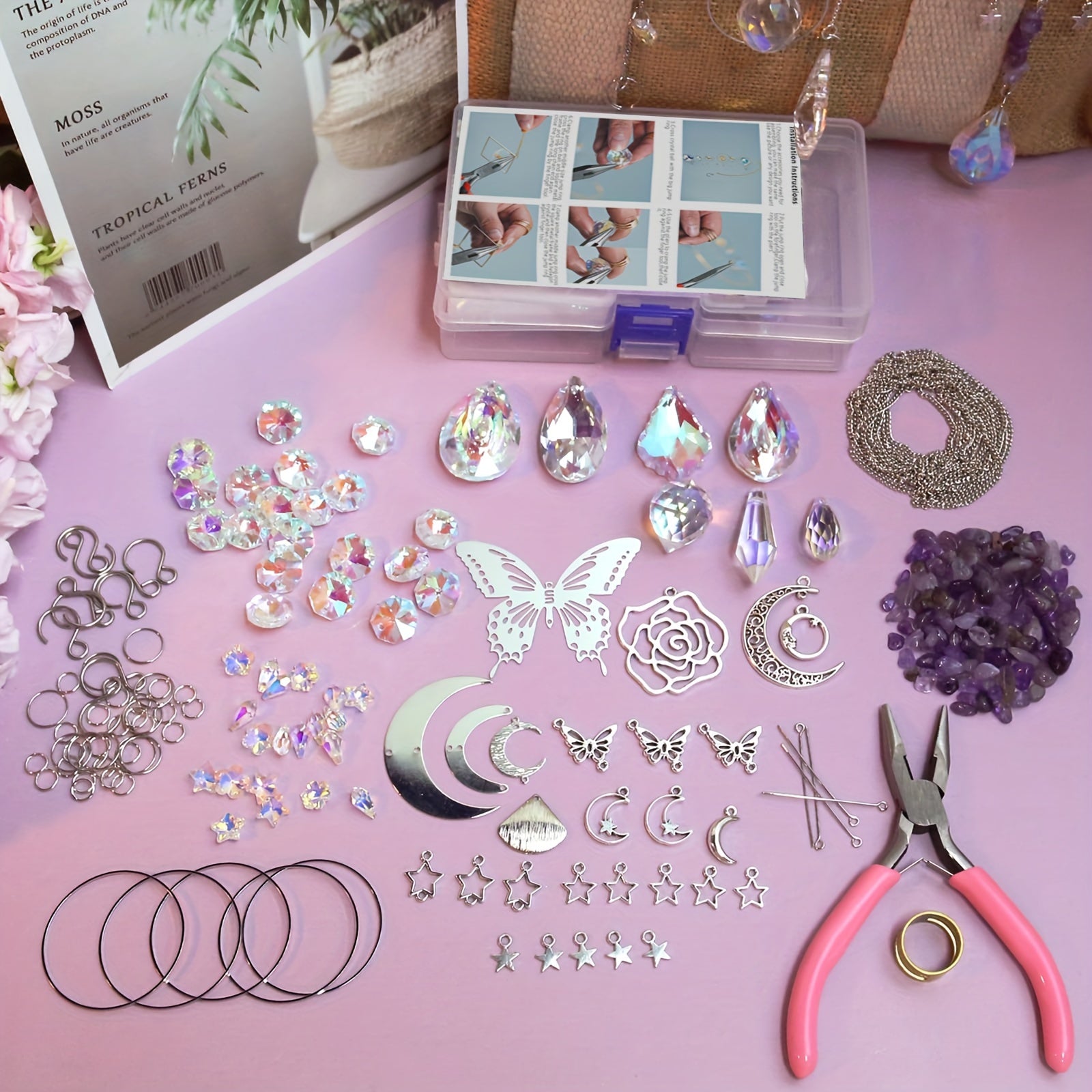 377 Pcs DIY Crystal Catcher Rainbow Making Craft Kit, butterfly rose, light catcher, making tools, window garden decorations (silver)