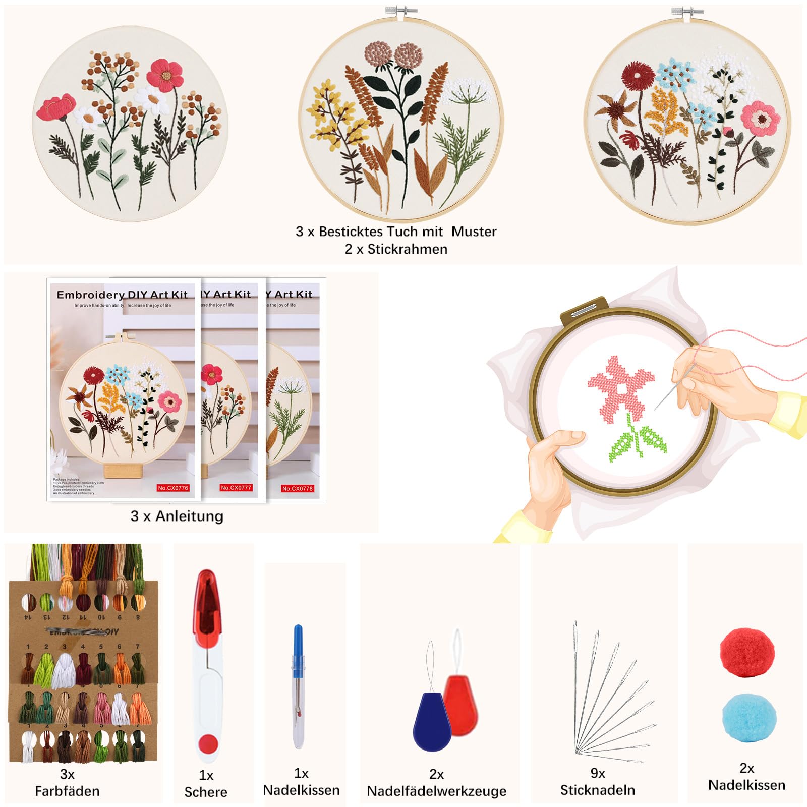 • Ciseaux, 1 x Outil de détorsion, Avec l'ensemble complet d'outils et d'instructions, vous pouvez broder cet ensemble genießen.Es il est à noter que les aiguilles à broder sont situées sur le tissu brodé.