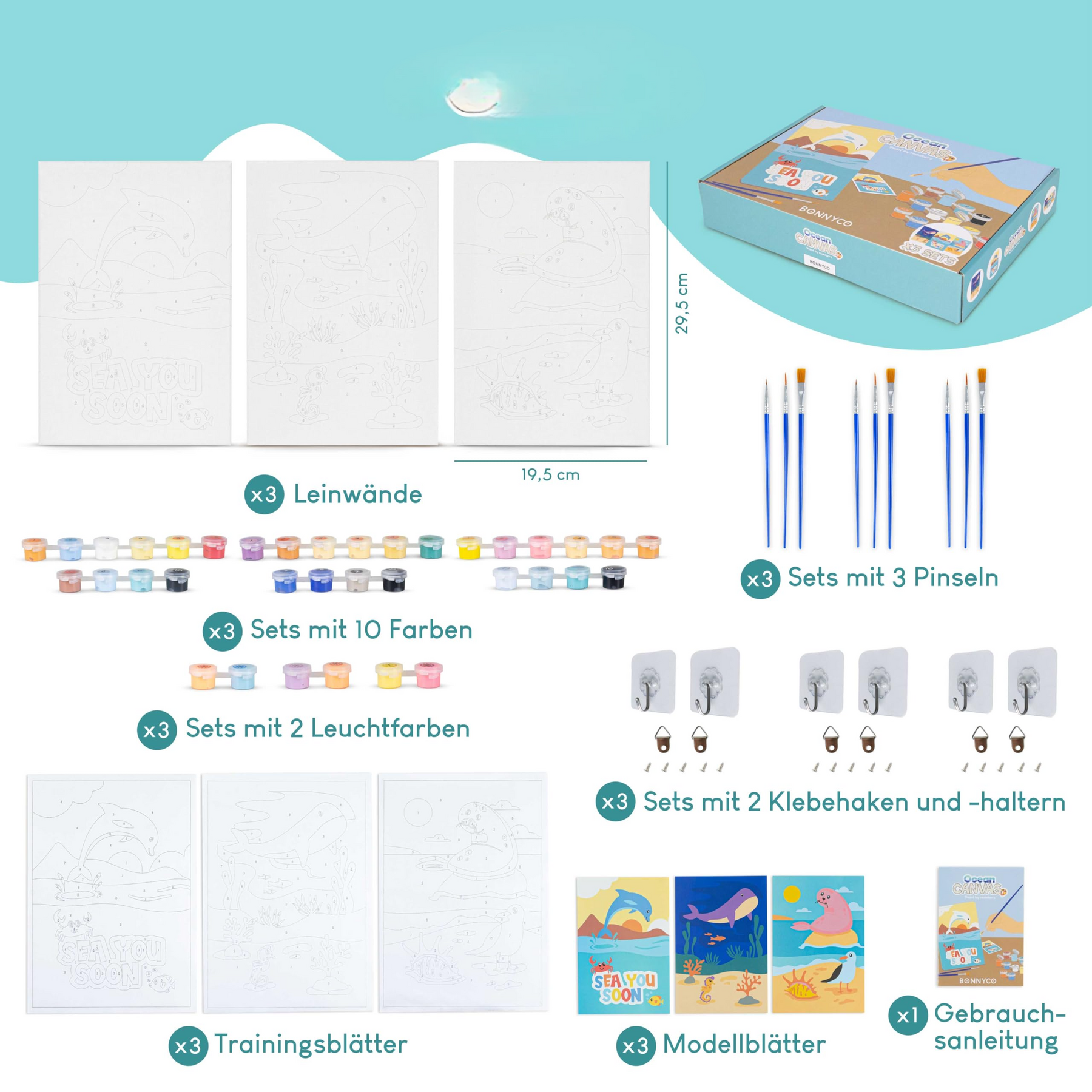 • Ce lot de 3 toiles à peindre pour enfants contient les éléments suivants pour chaque lot : 1 toile (29,5*19,5 cm), 10 couleurs, 2 couleurs phosphorescentes, 3 pinceaux, 2 crochets adhésifs, 2 cintres, 1 feuille d'exercices et 1 carte d'instructions avec l'image finale de la toile. L'emballage contient également des instructions pour l'utilisation correcte du produit.