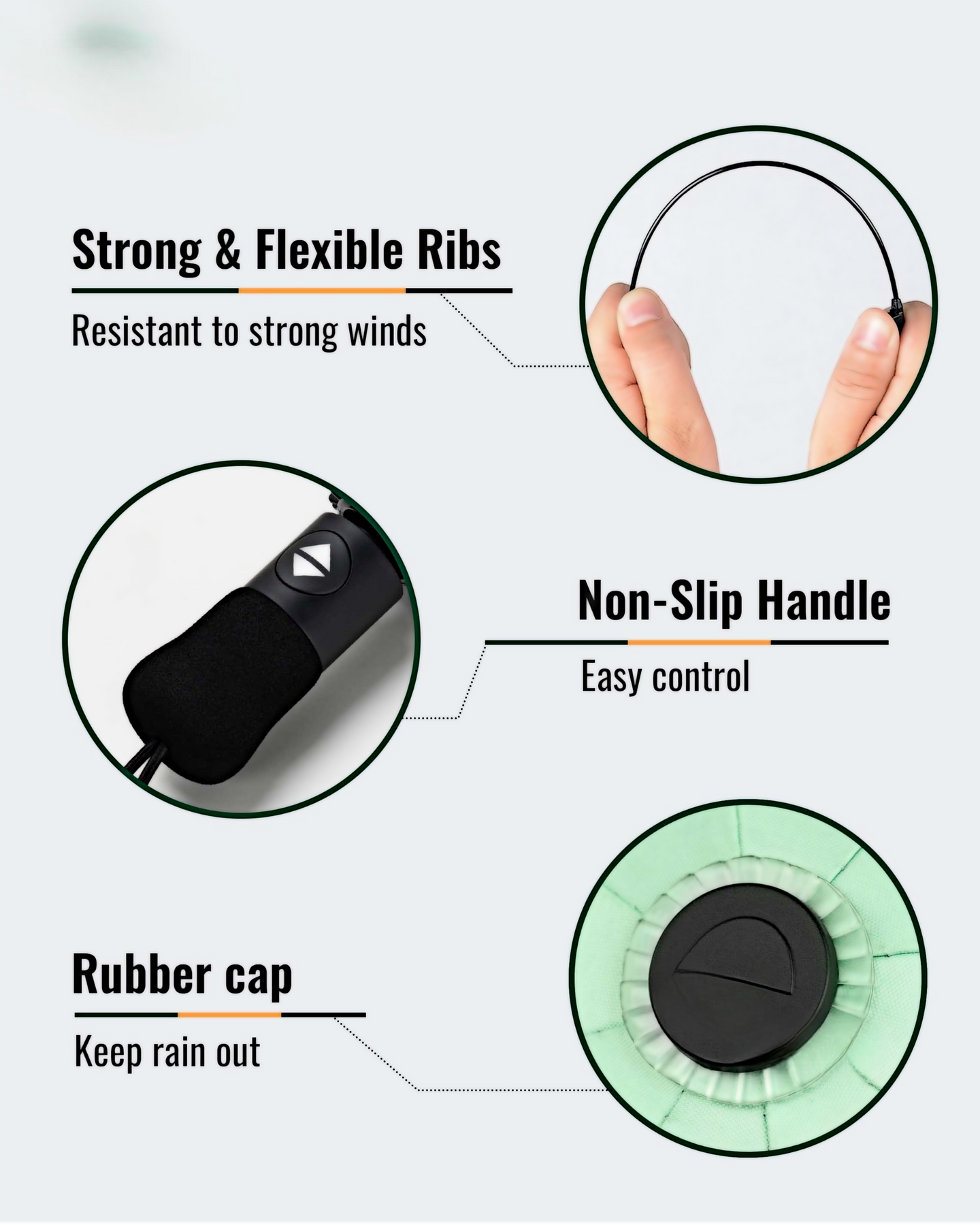 • Nos parapluies pliants coupe-vent sont fabriqués en polyester 210T extrêmement imperméable ainsi que des matériaux de protection UV pour assurer une protection contre la pluie et le soleil.