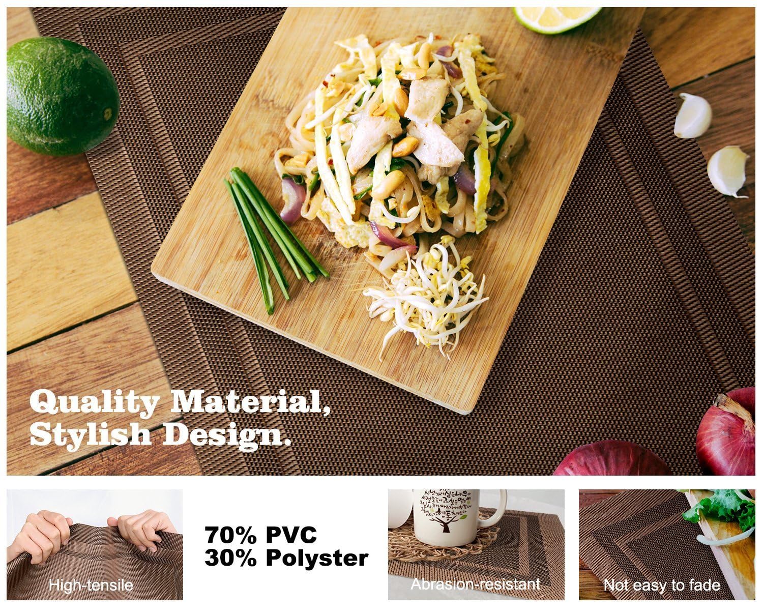 • Le napperon est fait de 70% de PVC et de 30% de fil de polyester, qui est conforme à la FDA et combiné avec un tissu de haute qualité, ce qui rend la couleur inaltérable et plus durable. La résistance à la chaleur la plus élevée est de 80 °C(176℉), ce qui est suffisant pour protéger la table de la chaleur et créer une atmosphère de repas confortable.