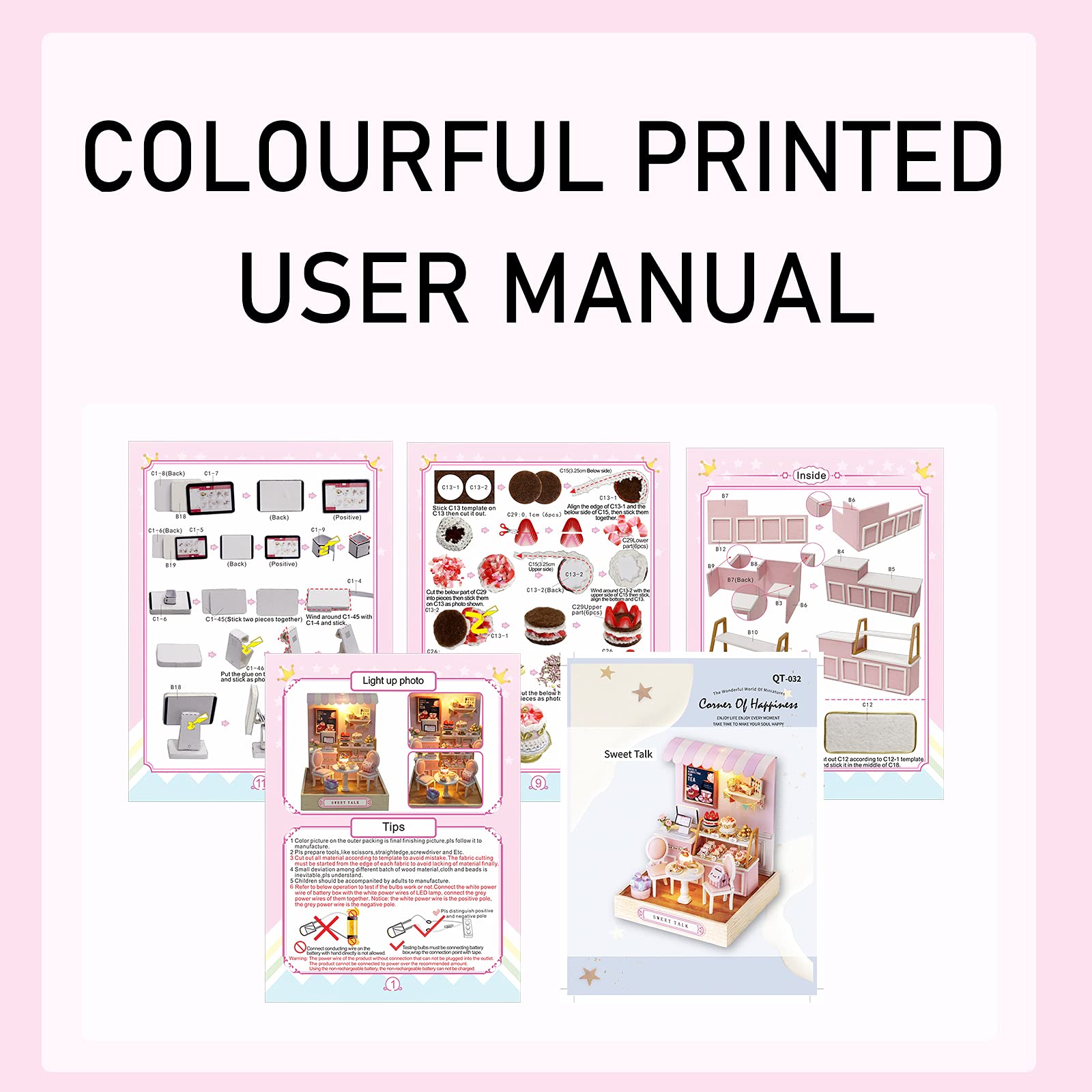 L'assemblage convient aux personnes de plus de 14 ans, un excellent moyen de communiquer avec des adolescents ou des adultes et un projet parfait pour passer du temps. Mini chambre mignonne-Nous avons pris beaucoup de temps pour trouver le matériau qui ressemble à la vraie maison. Accessoires (petites pâtisseries, nombreux desserts proposés, tables, etc.), si mignons et beaux kits de maison de poupée miniature DIY Kits d'excellente qualité - Les plantes sont très réalistes et intelligemment conçues. Les meubles et autres pièces en bois sont découpés avec précision pour s'emboîter correctement. Les instructions sont en anglais et en couleur, elles sont donc assez faciles à suivre même si certaines étapes sont difficiles à exécuter.