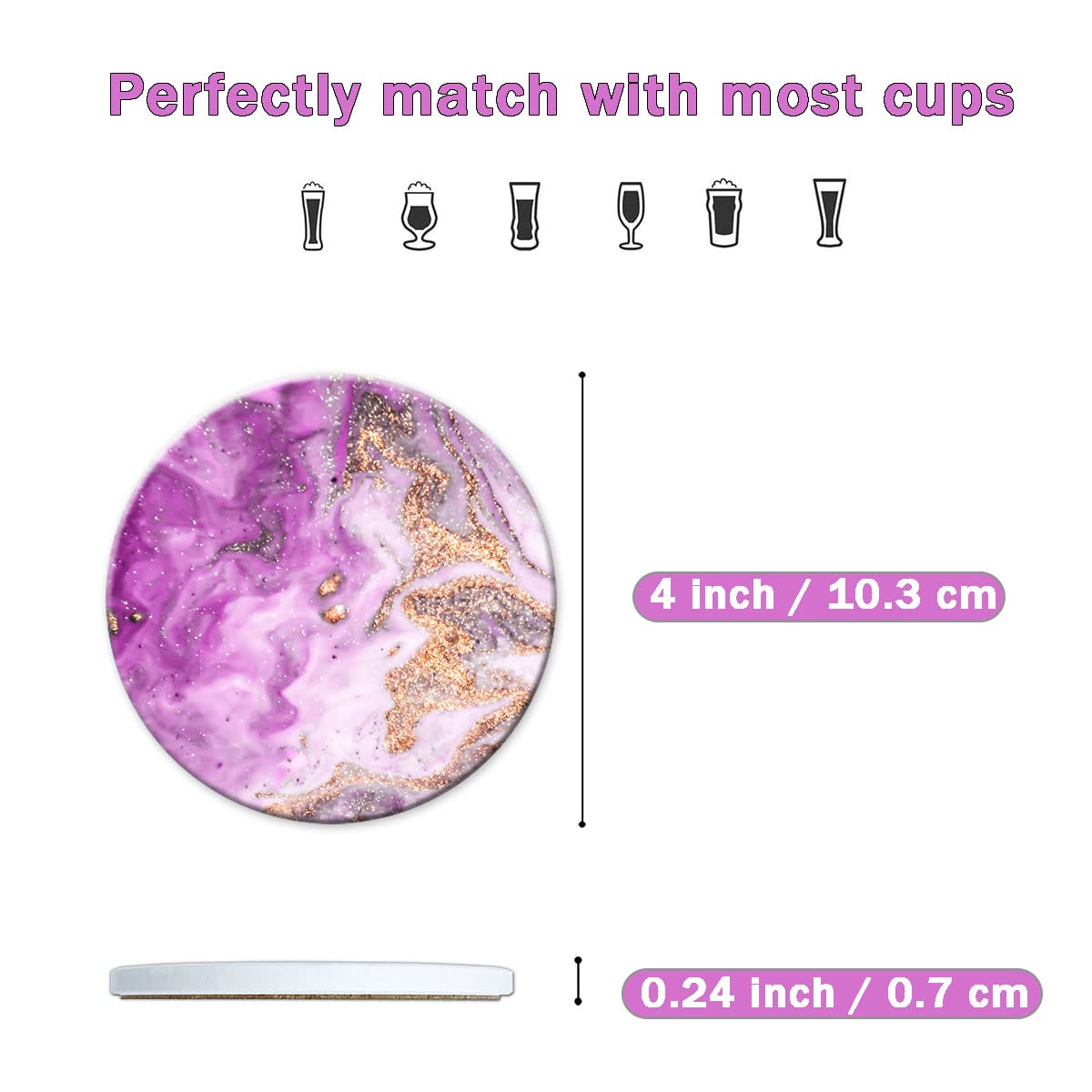 • Notre dessous de verre d'un diamètre de 4 pouces convient aux verres à cocktail, verres à bière, gobelets, tasses à café, tasses en plastique, tasses en silicone et petits couverts, donc pour presque tous les types de tasses. Peu importe la tasse avec laquelle il s'adapte, il est très agréable et coordonné.
