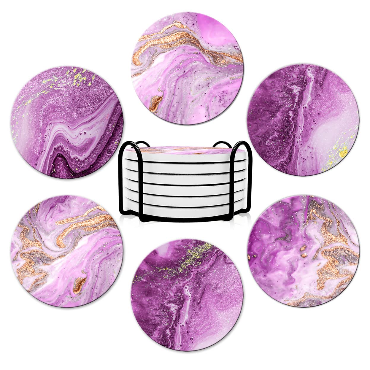 • Chaque ensemble est équipé d'un support en fer bien conçu pour organiser ou ranger les sous-verres. Il est anti-salissures, résistant aux rayures et ne rouille pas. Vous pouvez mettre les sous-verres directement dans le support lorsque vous ne les utilisez pas, ce qui rend votre maison plus rangée.
