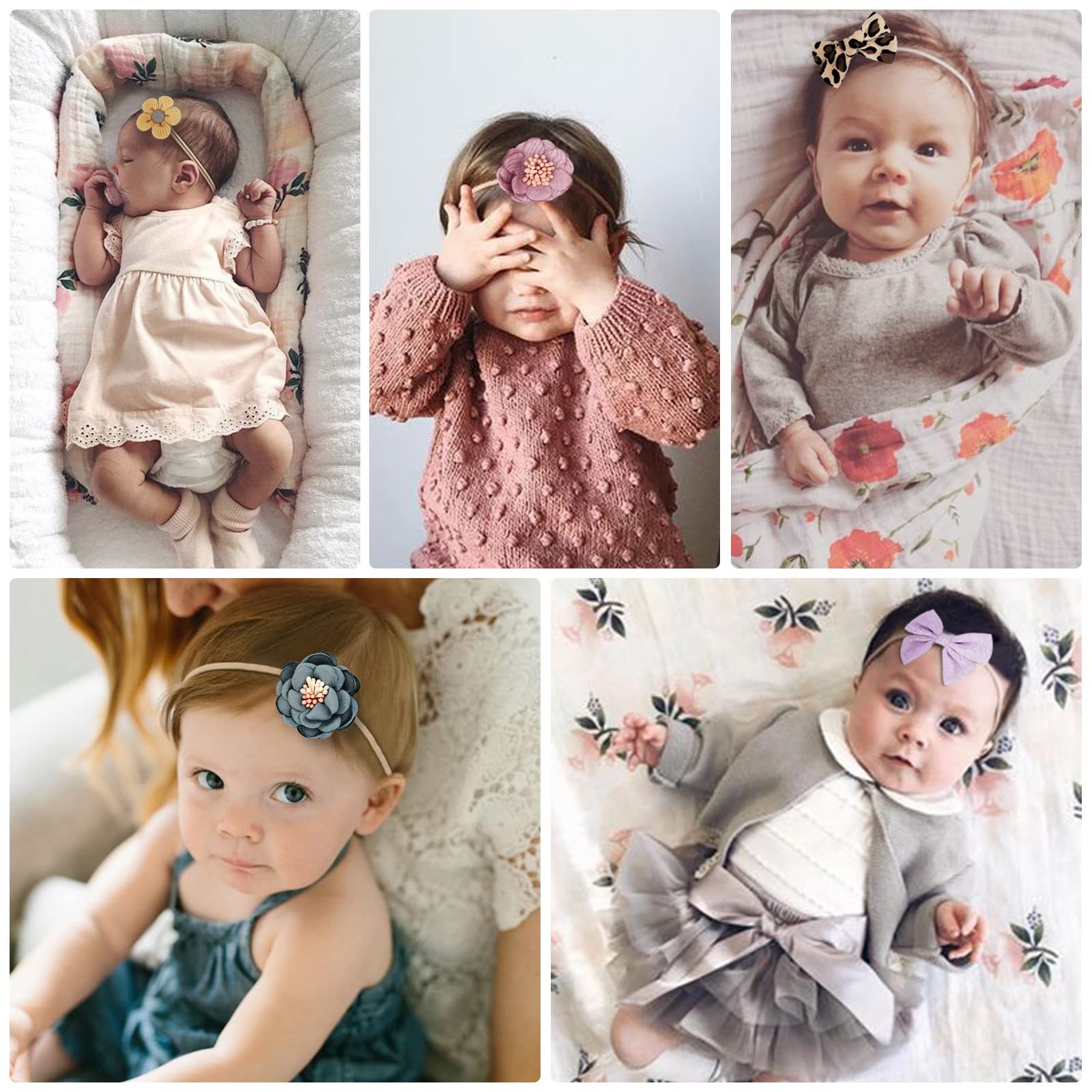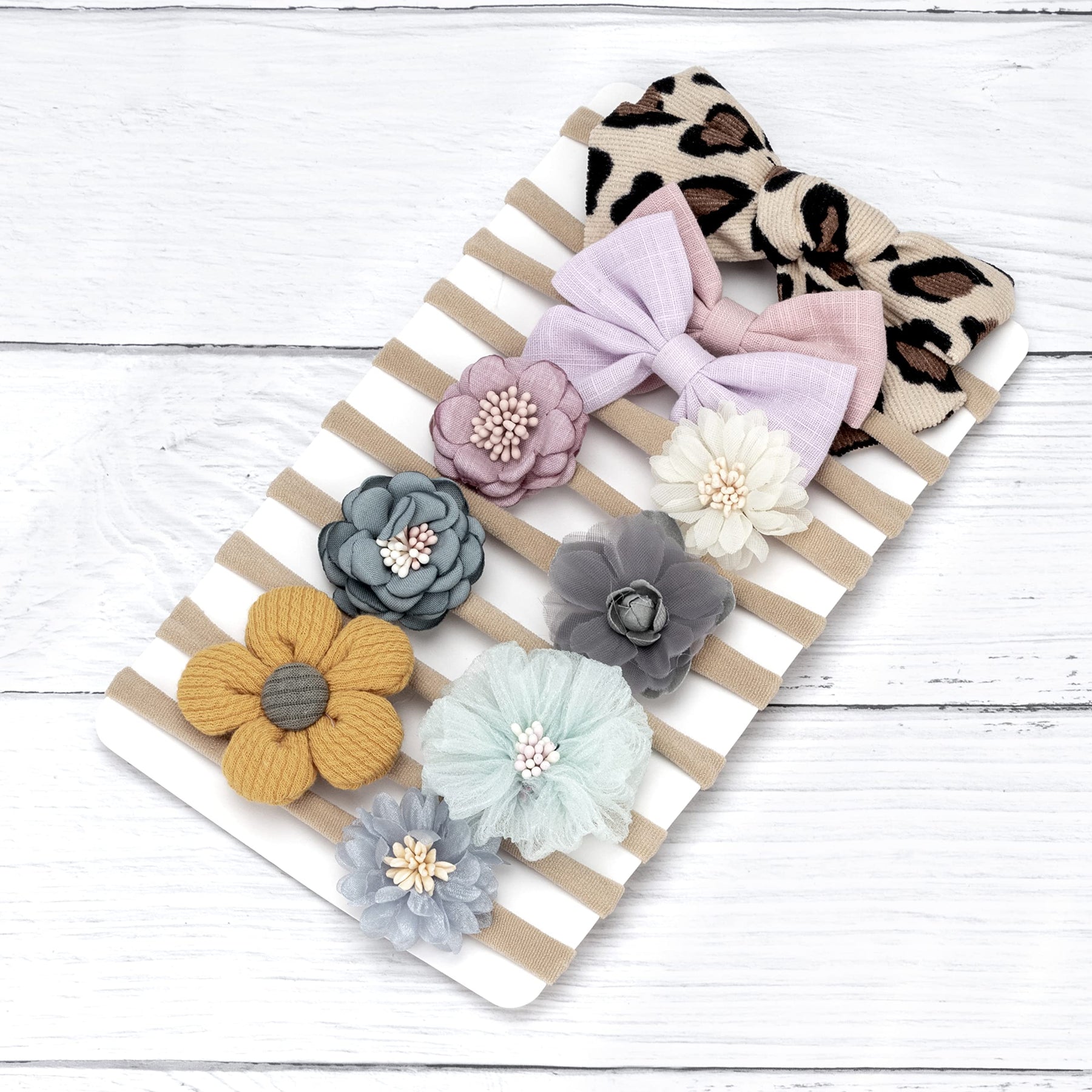 - 10 styles, couleurs et motifs différents pour correspondre à n'importe quelle tenue. L'assortiment de beaux nœuds pour cheveux nouveau-nés comprend une mini couronne de fleurs en feutre rose, un nœud en daim corail, un papillon rose, un vichy vert, de la dentelle blanche, du feutre gris, des fleurs, du velours moutarde, des motifs en chambray bleu et plus encore!