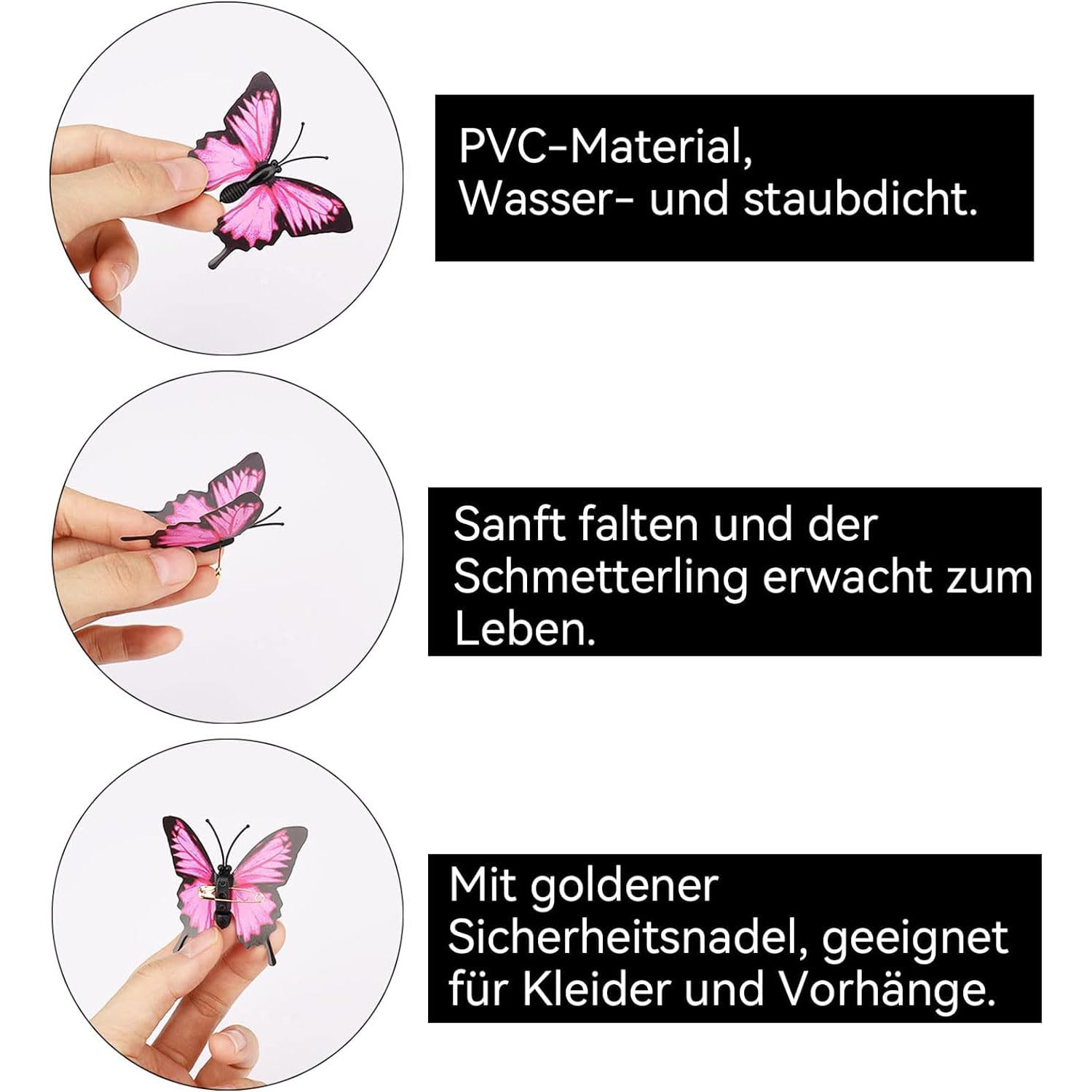• Fabriqué en PVC durable et imperméable, pas de colle, pas d'autocollant, chaque papillon est livré avec une épingle à nourrice, les ailes du papillon peuvent être ouvertes ou fermées à volonté pour montrer différents angles.