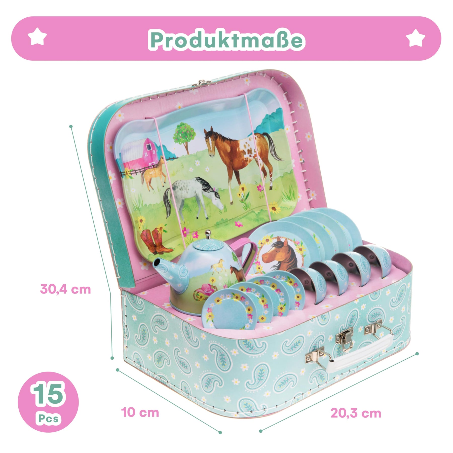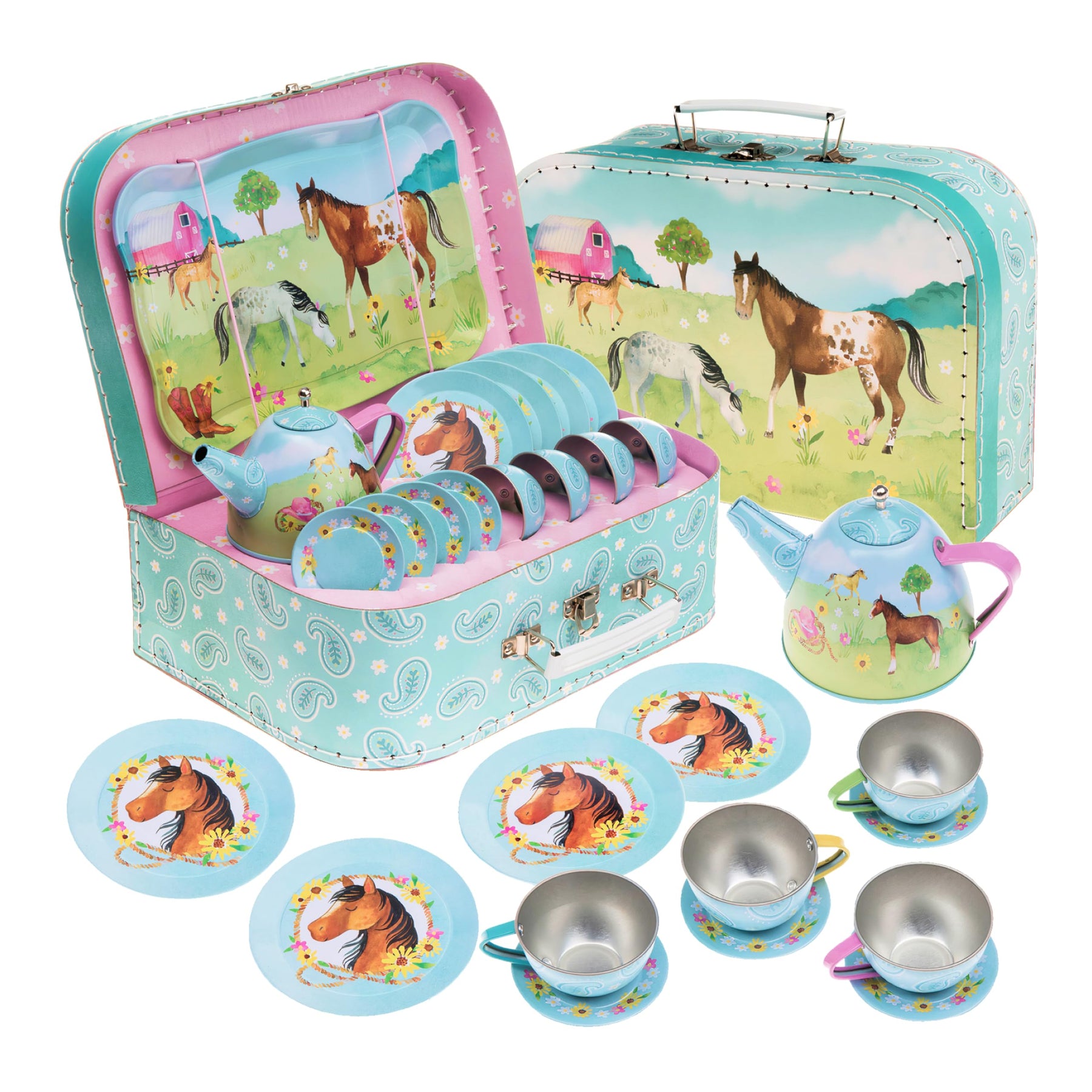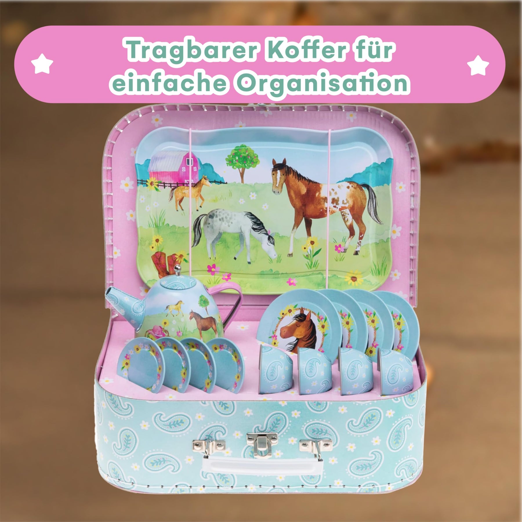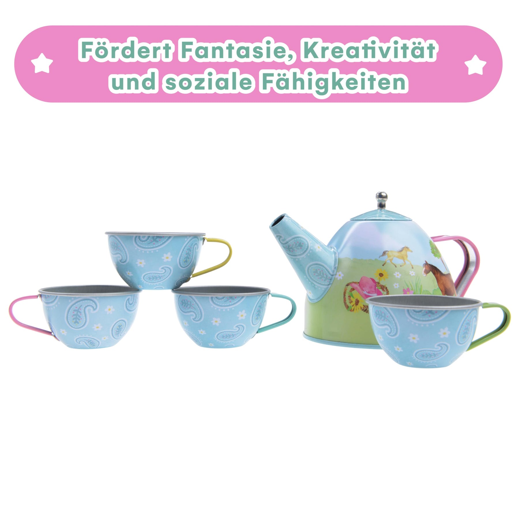 - Jouer à la fête du thé - Conçu pour jouer à faire semblant, cet adorable service à thé Jewelkeeper encourage les jeunes enfants à faire preuve d'imagination et à développer leur créativité et leurs aptitudes sociales. Le service à thé est décoré de chevaux qui sautent et d'une grange confortable.