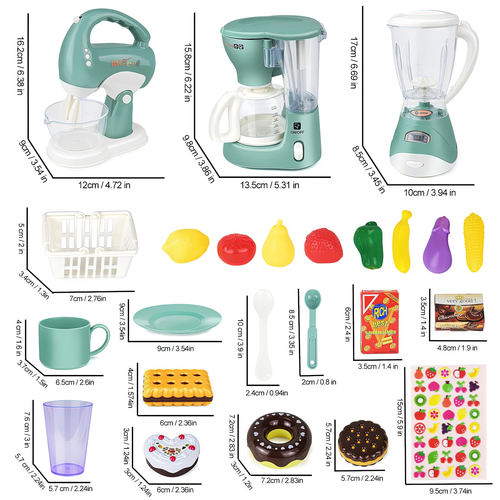 Outils de cuisine Play: comprend une machine à café, un mixeur, un mixeur, 8 fruits et légumes, 2 toasts, 2 biscuits, un panier, 2 tasses à café, 4 cuillères, 2 assiettes, 2 verres, du chocolat et du fromage, des gâteaux, des beignets et des autocollants 3D.