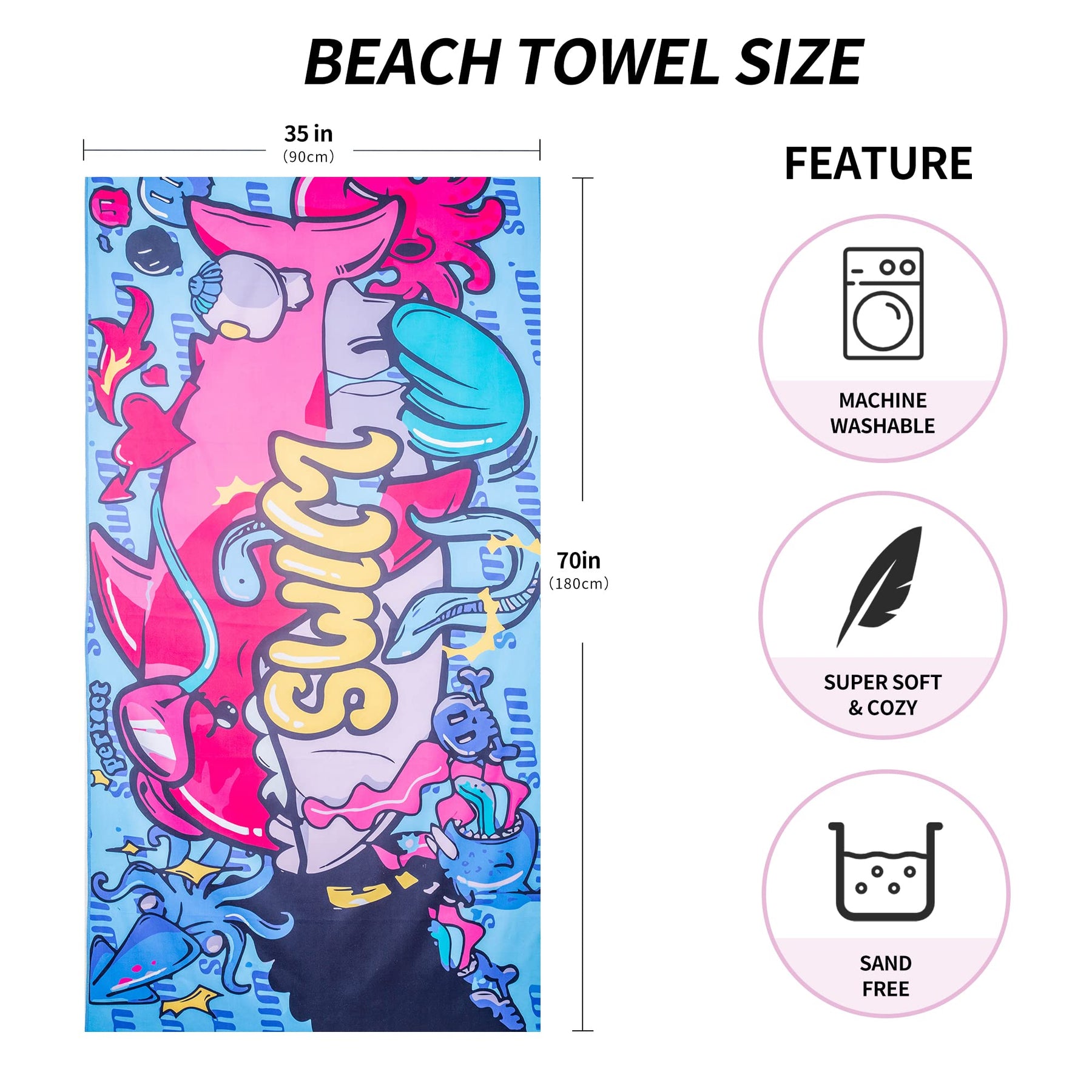 • Grande serviette de plage : 180*90 cm, une grande taille adaptée à la douche et à la plage. Avec un poids de 320 g, la serviette de plage légère n'alourdira pas votre sac, même lorsqu'elle est rangée à l'intérieur. Elle est livrée avec un crochet pour que vous puissiez la suspendre.