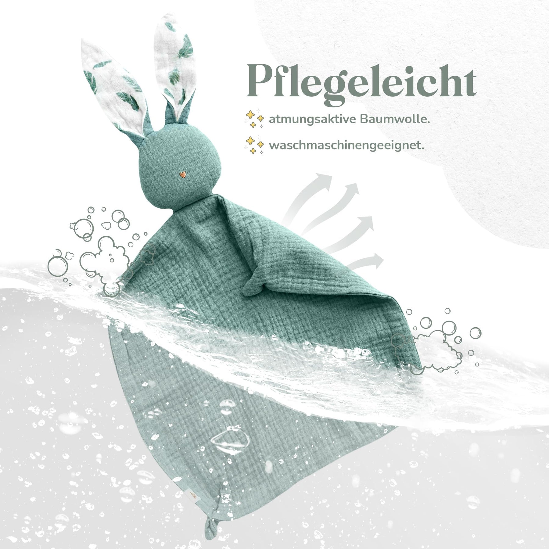 • Doudou en mousseline au design adorable avec un nez cousu à la main et un motif dans les oreilles du lapin. Lavable à 30 degrés - idéalement dans un filet à linge. Ne convient pas au séchage en machine.