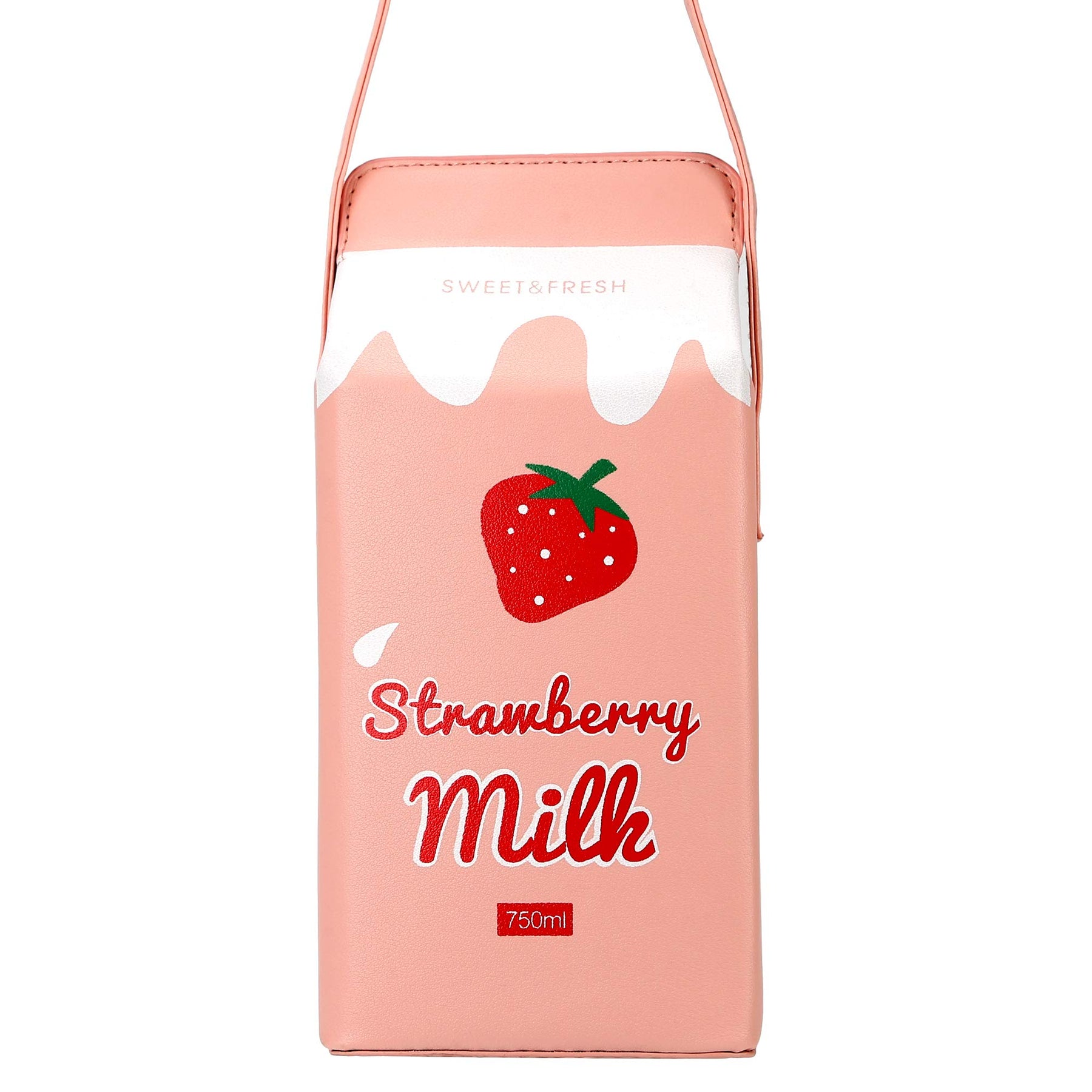 Design unique: fabriqué en PU, ressemble à une boîte à lait à la fraise. Ça a l'air très mignon et intéressant. Structure: sac avec 1 boucle.
