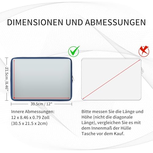 • Specially compatible with 11-11.6 MacBook/Laptop/Tablet/Notebook. Outer dimensions: 31.5 x 23 x 2.0 cm(12.4 x 9.06 x 0.8 inches), Inner dimensions: 30.5 x 21.5 x 2.0 cm(12.01 x 8.46 x 0.8 inches). If you particularly need a snug or loose fit, please check the actual dimensions of your laptop before purchasing, as different models and brands have different sizes