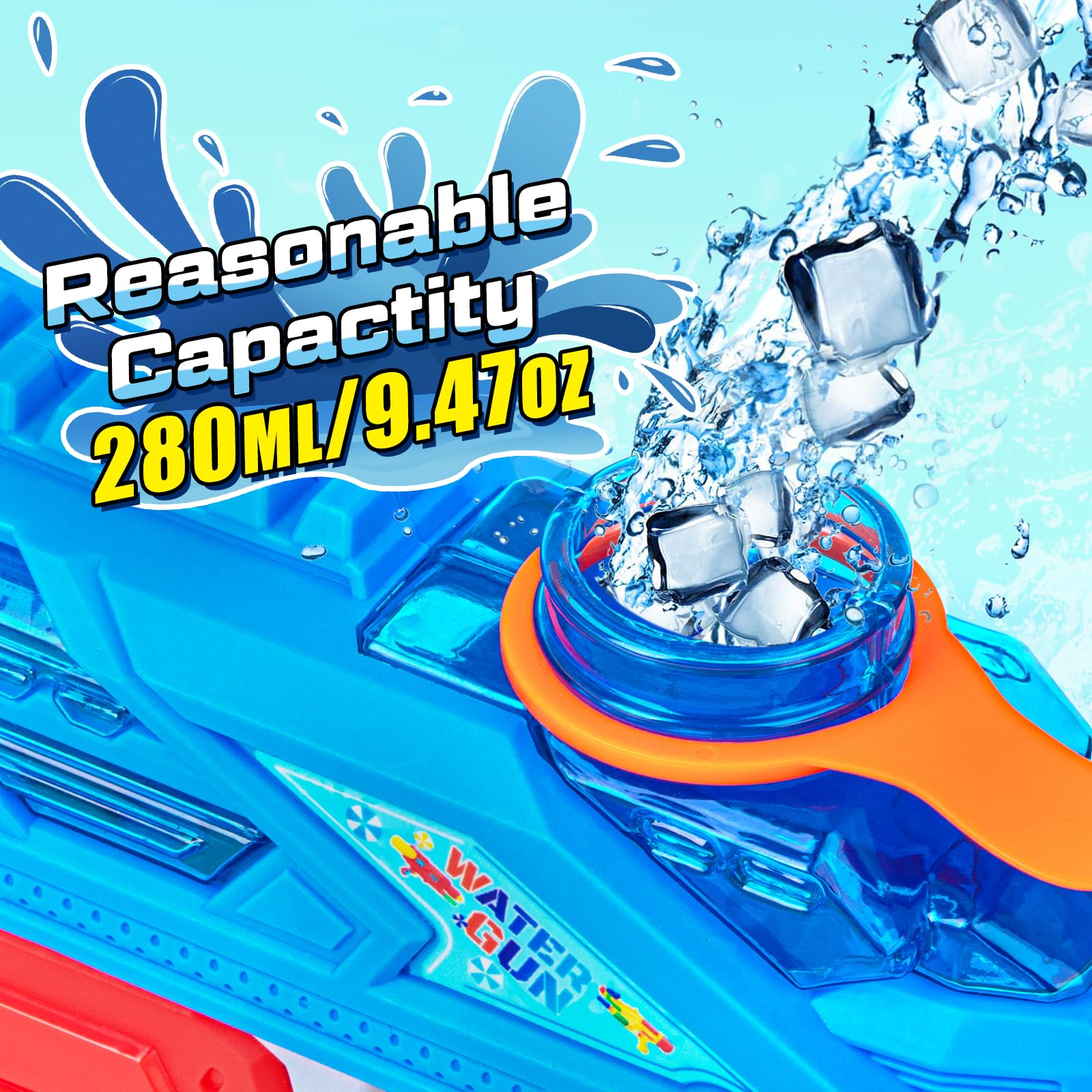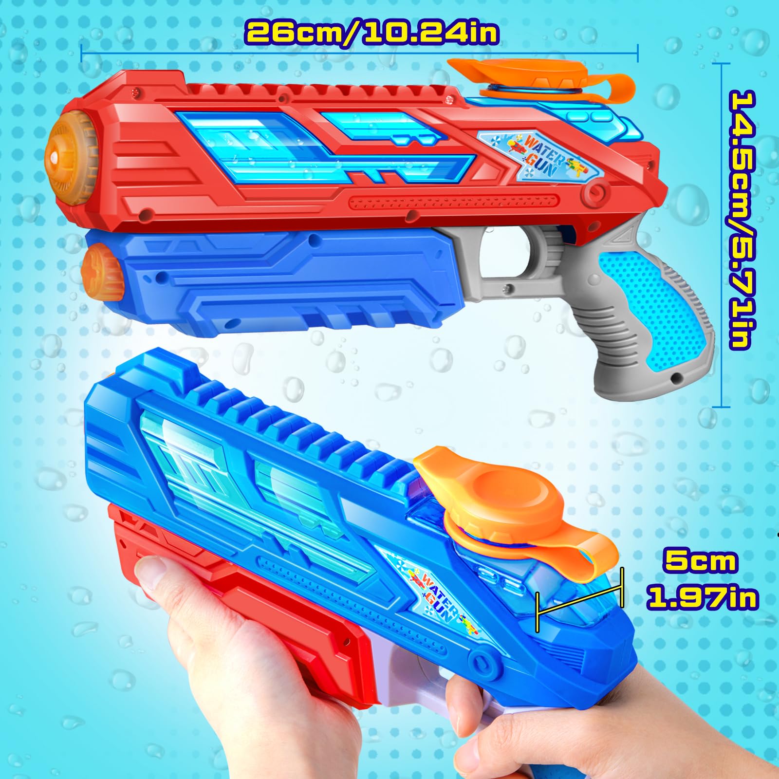 - Portée et capacité de tir - La plus longue portée de nos pistolets à eau est d'environ 8,8 mètres.Chaque pistolet à eau a une capacité d'eau d'environ 280 ml (300 CC).Sa longueur, sa largeur et son épaisseur sont respectivement de 26 cm, 14,5 cm et 5 cm