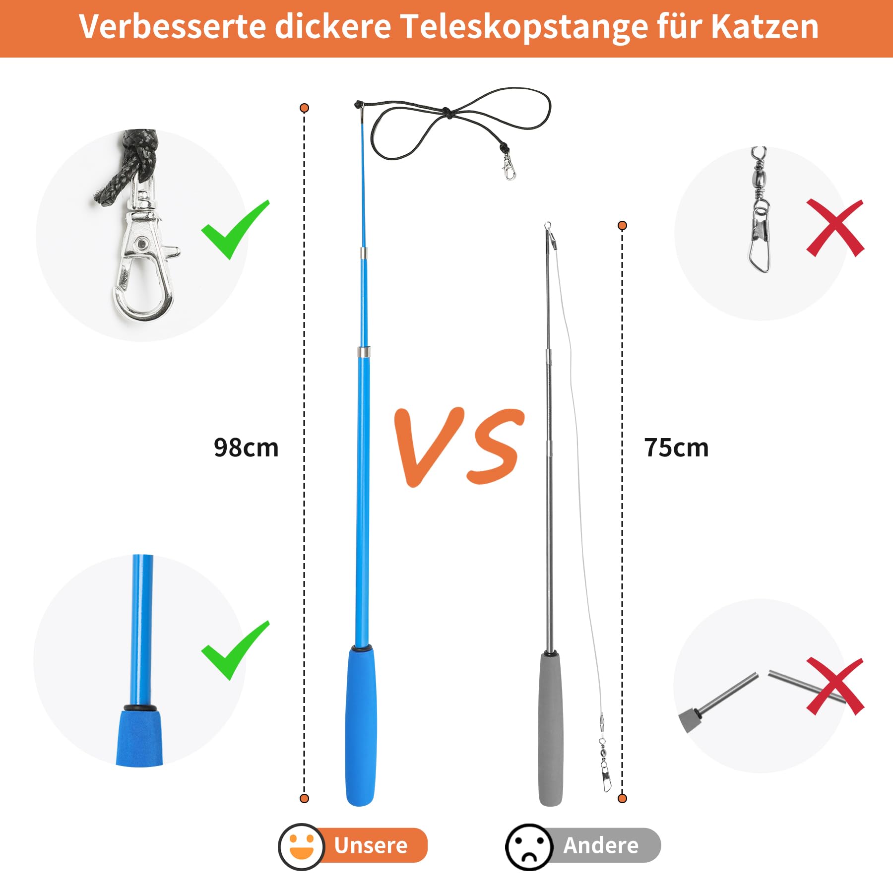 Les plumes naturelles inspirent la sauvagerie du chat et sont adaptées aux chats. Le jouet de pêche télescopique est fabriqué dans un matériau plus élastique et plus dur, plus épais et plus durable. La poignée du jouet de pêche est en mousse EVA et est très confortable à tenir. Et le crochet amélioré sur la ligne permet de remplacer facilement différents jouets. Votre jouet interactif simple: Avec ces jouets en plumes, vous pouvez facilement interagir avec votre chat. La canne à pêche télescopique s'étend assez loin (de 30 cm à 98 cm) et la corde est suffisamment longue pour couvrir un plus grand espace pour que le chat puisse jouer et éloigner vos doigts des griffes acérées, afin que vos mains ne soient pas rayées. Par conséquent, vous pouvez entraîner votre chaton pour qu'il n'attaque pas vos mains et vous pouvez jouer avec plus de chats
