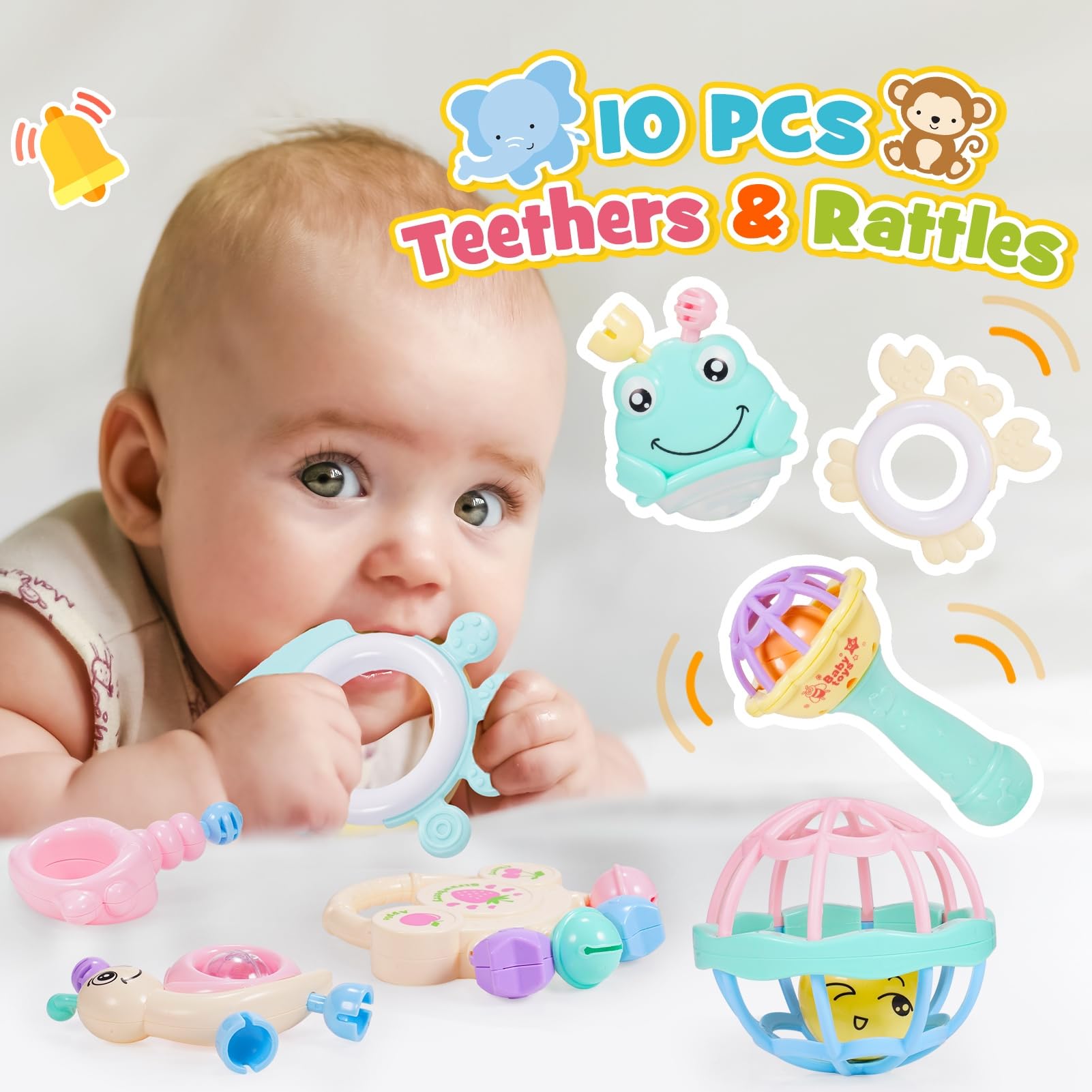 - Visuel : 14 hochets pour bébé avec une large gamme de couleurs vives, idéal pour la reconnaissance des couleurs de bébé ; Auditif : Les hochets émettent des sons agréables lorsqu'on les agite, ce qui stimule le développement auditif de bébé. Tactile : Les différentes formes des hochets et les chaussettes de hochets sur le poignet encouragent votre enfant à les toucher, à les saisir et à les regarder.