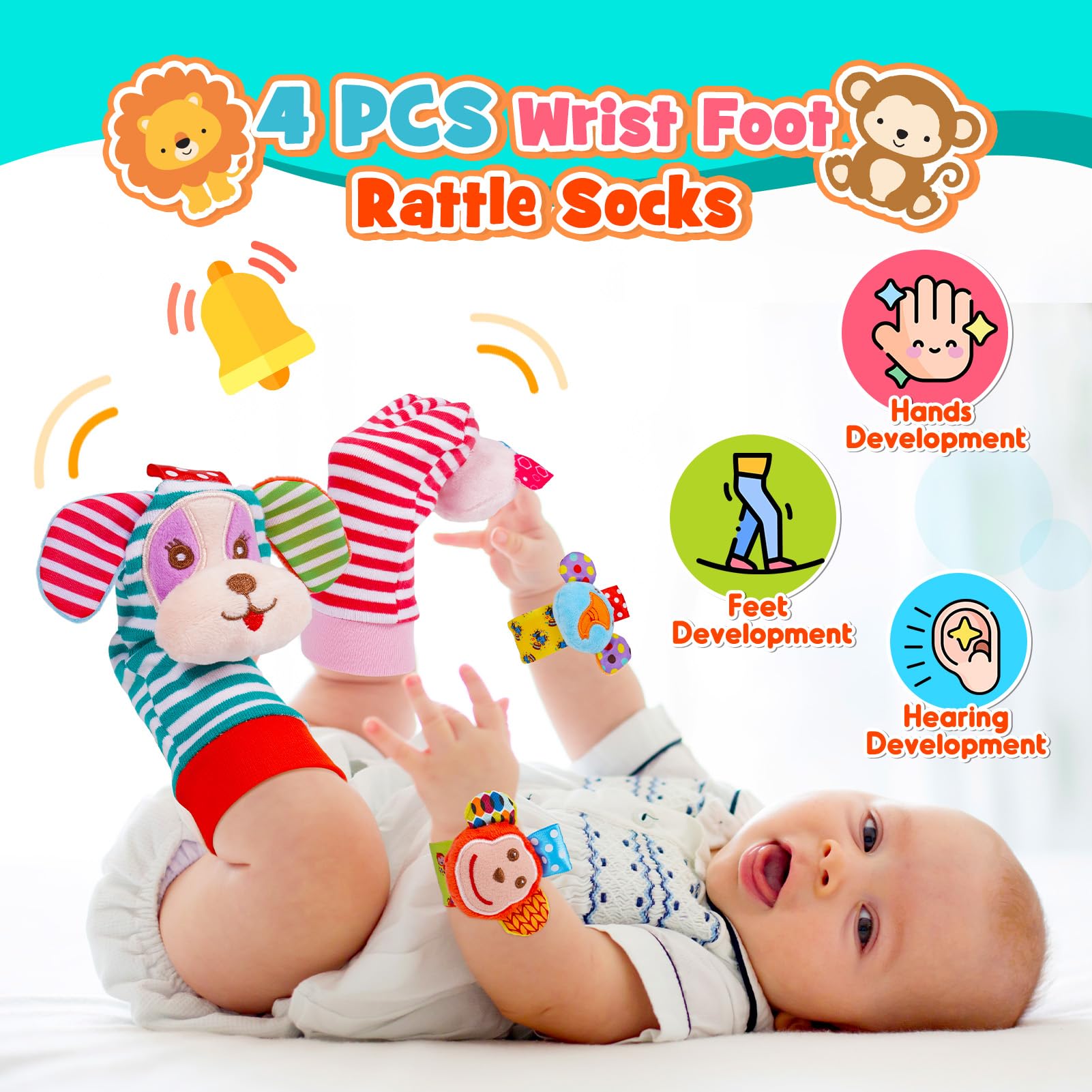 - Visuel : 14 pièces de hochets pour bébés avec une large gamme de couleurs vives, idéales pour la reconnaissance des couleurs par les bébés ; Auditif : Les jouets hochets émettent des sons agréables lorsqu'ils sont secoués, ce qui peut stimuler le développement auditif de bébé ; Tactile : Les différentes formes des jouets hochets et des chaussettes hochets au poignet incitent votre enfant à les toucher, à les saisir et à les regarder.