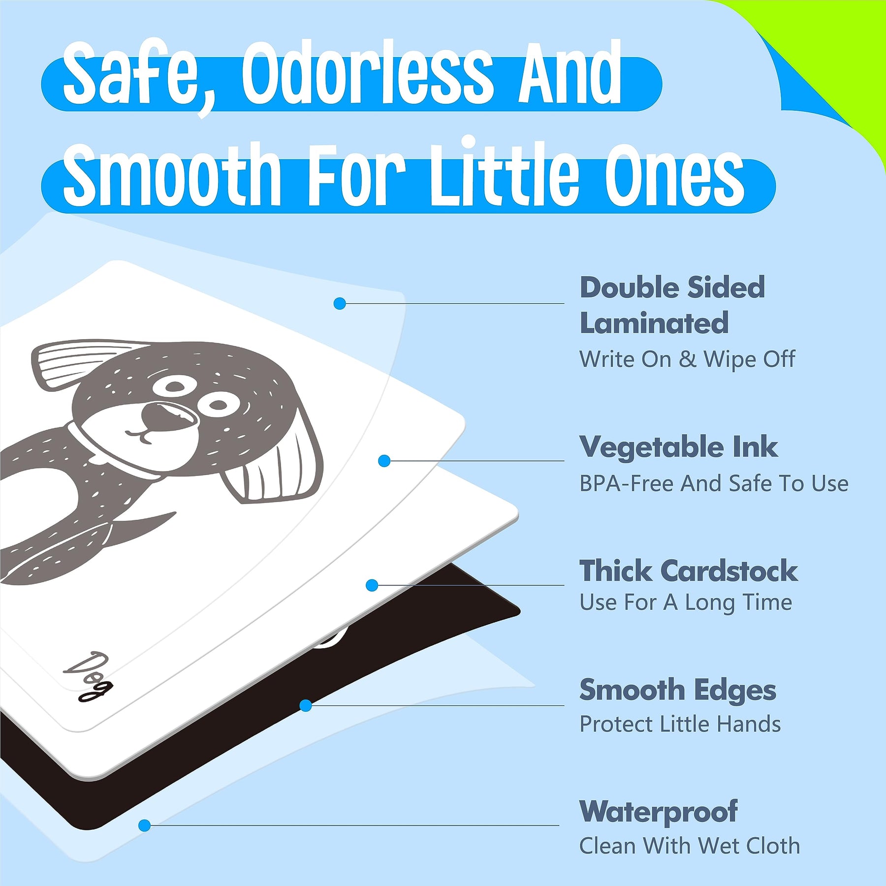 • Haute qualité : carton de qualité photographique avec revêtement antireflet de haute qualité, facile à voir et protégeant bien les yeux de bébé. Imprimé à l'aide d'une encre à base d'huile végétale de haute qualité et non toxique, avec un effet très brillant. Sans BPA et sans danger pour l'utilisateur. Toutes les cartes ont des coins arrondis et des bords lisses, suffisamment sûrs pour que les petites mains de bébé puissent les saisir.