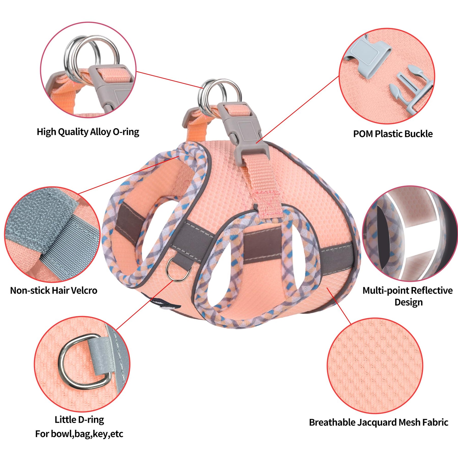 - Tissu jacquard respirant: Le harnais pour chien est fabriqué avec un tissu jacquard à haute densité, respirant, tridimensionnel, doux et confortable, et peut empêcher la mastication ou la déchirure. Le harnais pour petit chien a une durabilité, une résistance à la traction, une résistance à la déchirure et une résistance à la fusion extrêmement élevées. De plus, le harnais pour chiot présente les caractéristiques d'absorption d'humidité et de transpiration, ce qui crée de la sécheresse, ce qui procure aux animaux une expérience de port extraordinaire.