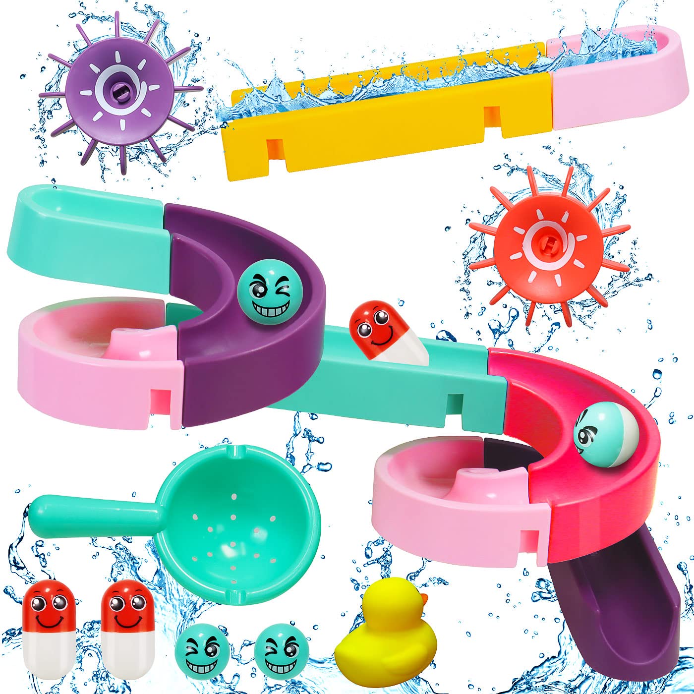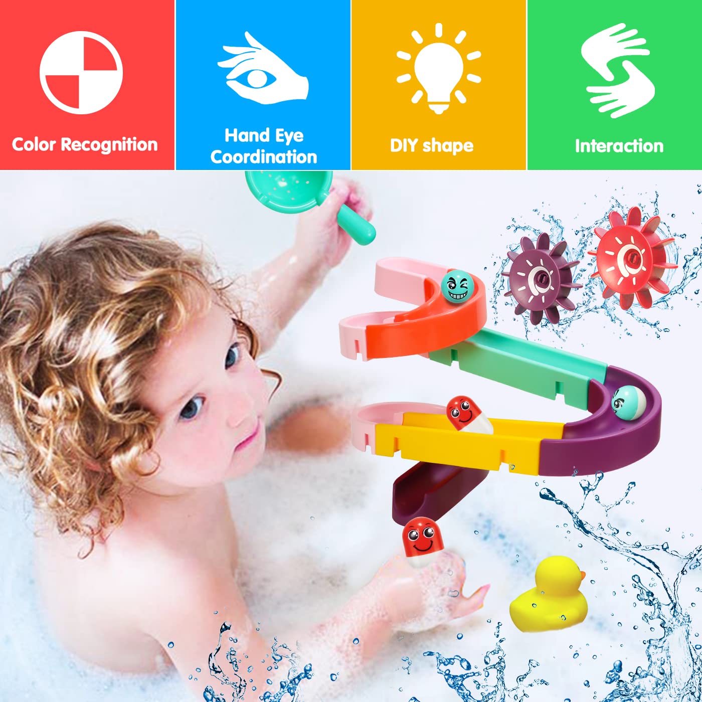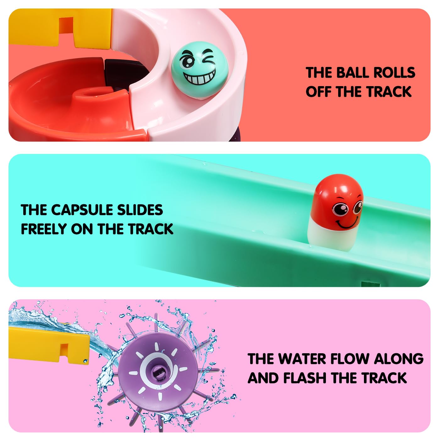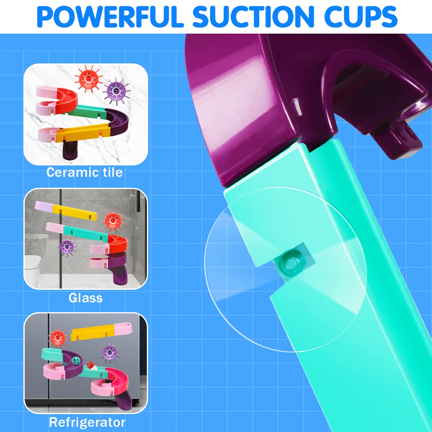 • Concevez-le vous-même: Cet ensemble de jouets de bain contient 24 pièces, y compris des pièces colorées, des ventouses et des jouets coulissants, etc. Cependant, vous pouvez concevoir les pistes comme vous le souhaitez – avec de nombreuses courbes ou droites, de haut en bas, à gauche ou à droite. Vous pouvez faire glisser 6 jouets coulissants sur les pistes conçues par vous, comme une course de billes.