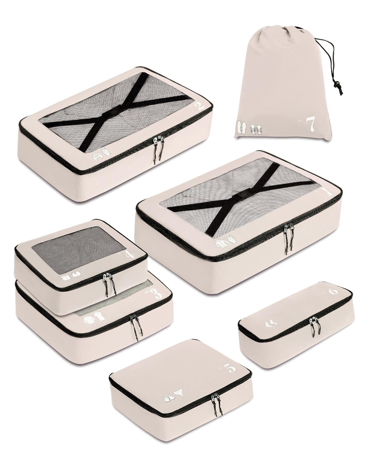 - L'ensemble comprend sept sacs de commande de voyage: deux grands sacs en filet avec sangles de fixation pour vestes et jeans, deux sacs moyennement respirants pour T-shirts, un sac à sous-vêtements, un sac à chaussettes et un sac à chaussures à cordon pour une paire de chaussures. Différentes tailles et la conception en maille visible facilitent l'emballage.