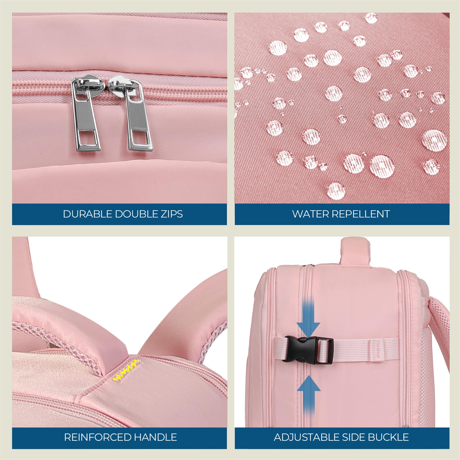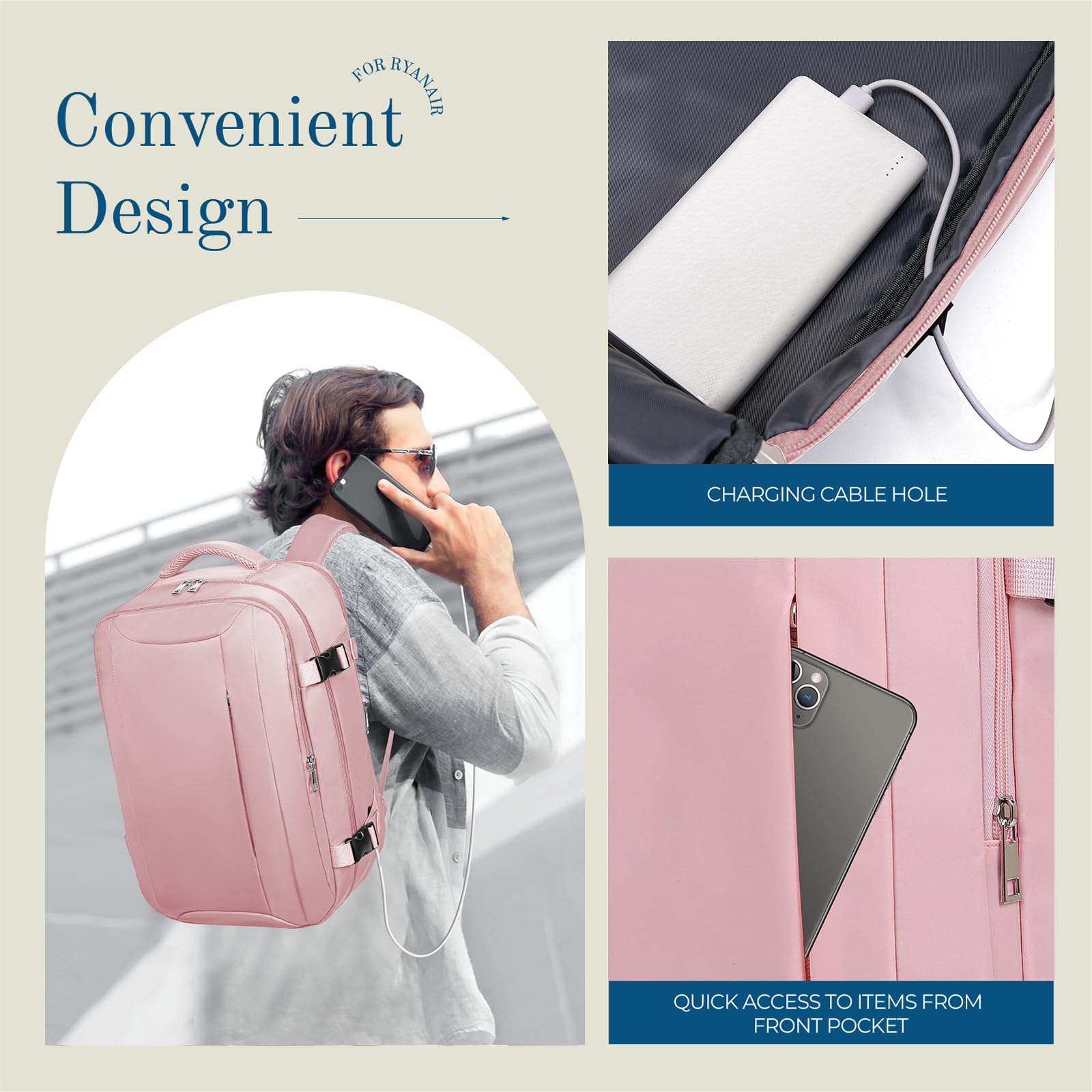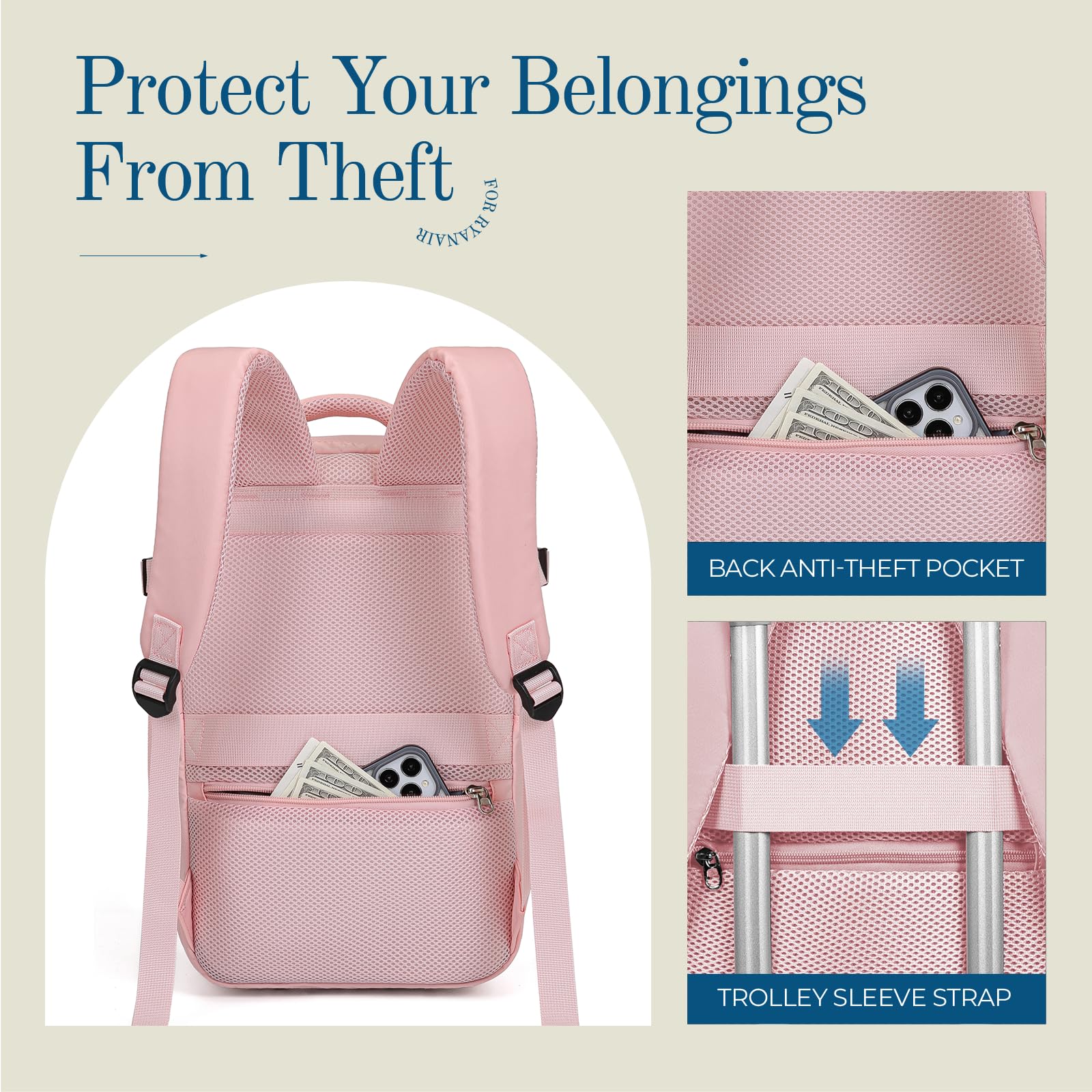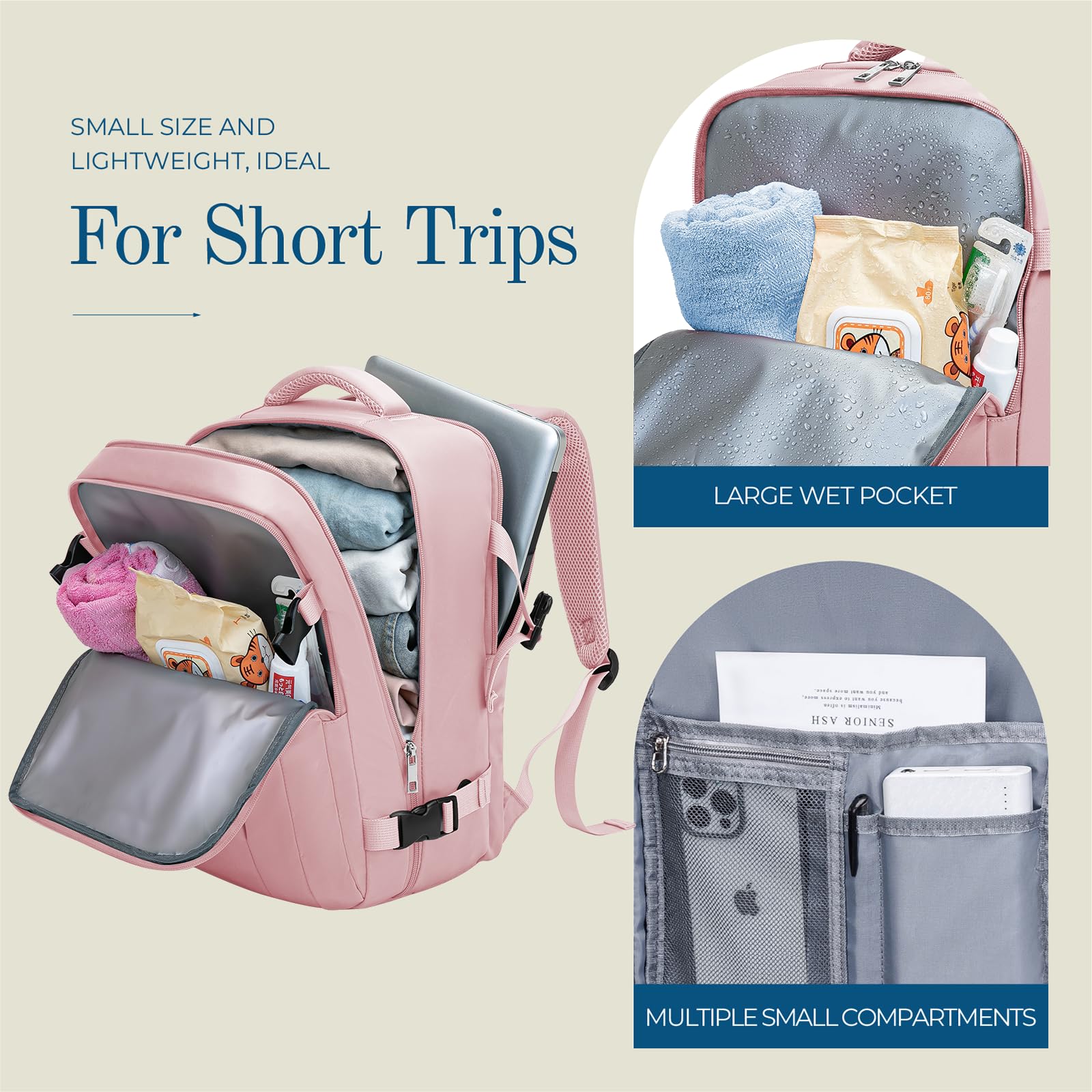 • Pochette humide séparée pour parapluie, serviette ; une pochette avec élastique pour ordinateur portable, une pochette intérieure zippée en filet pour téléphone, cartes d'identité ; deux poches intérieures ouvertes pour iPad, magazine ; pochette frontale pour billet, clés ; grand compartiment principal pour vêtements, autres articles de voyage essentiels ; une pochette antivol pour téléphone, etc.