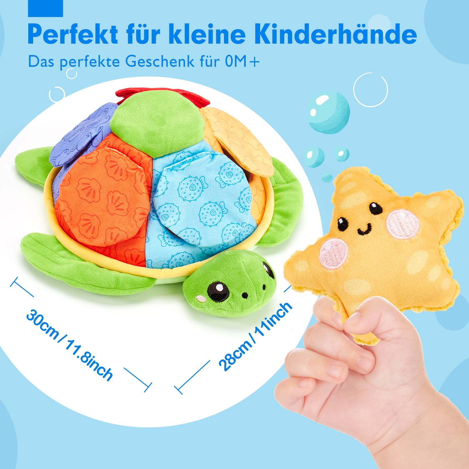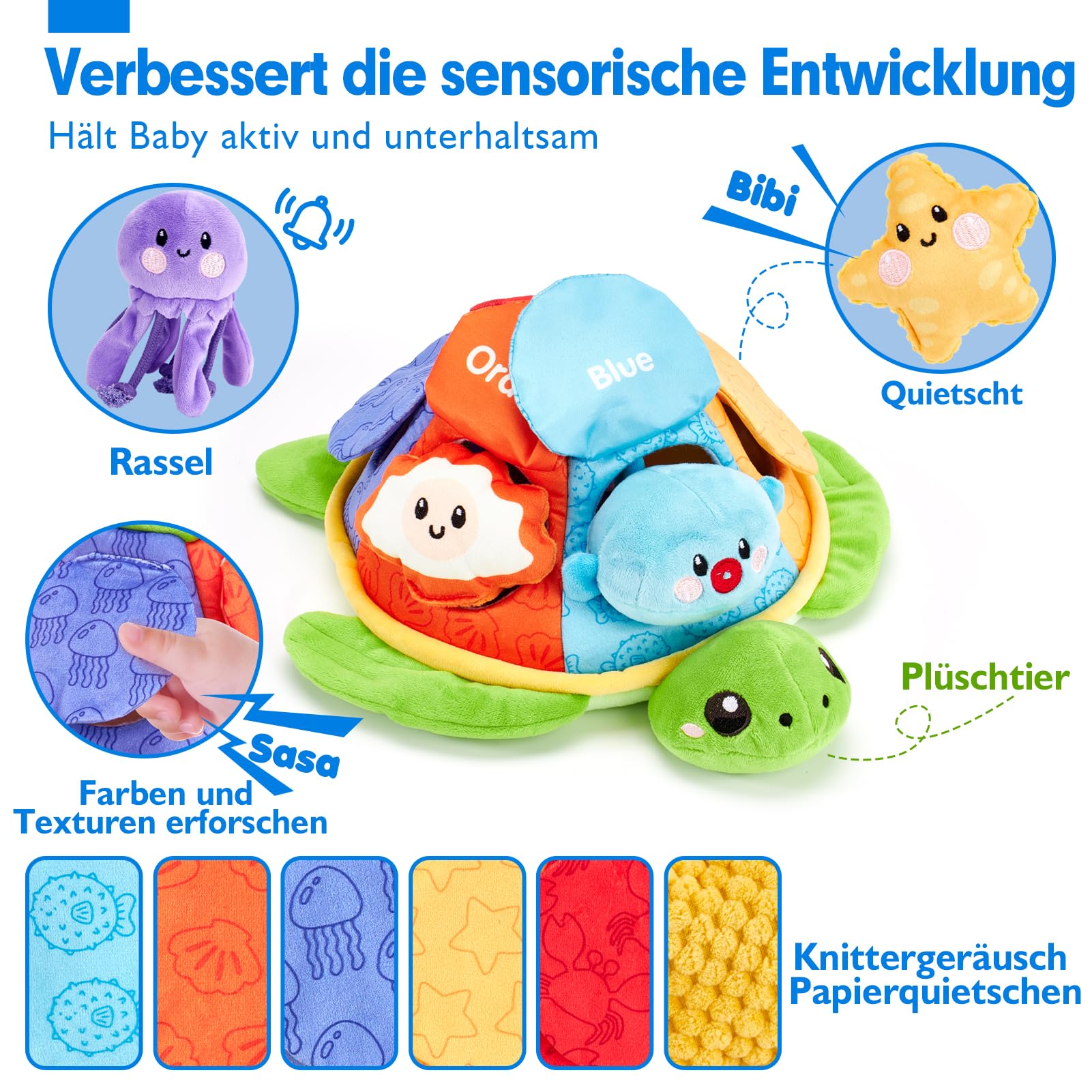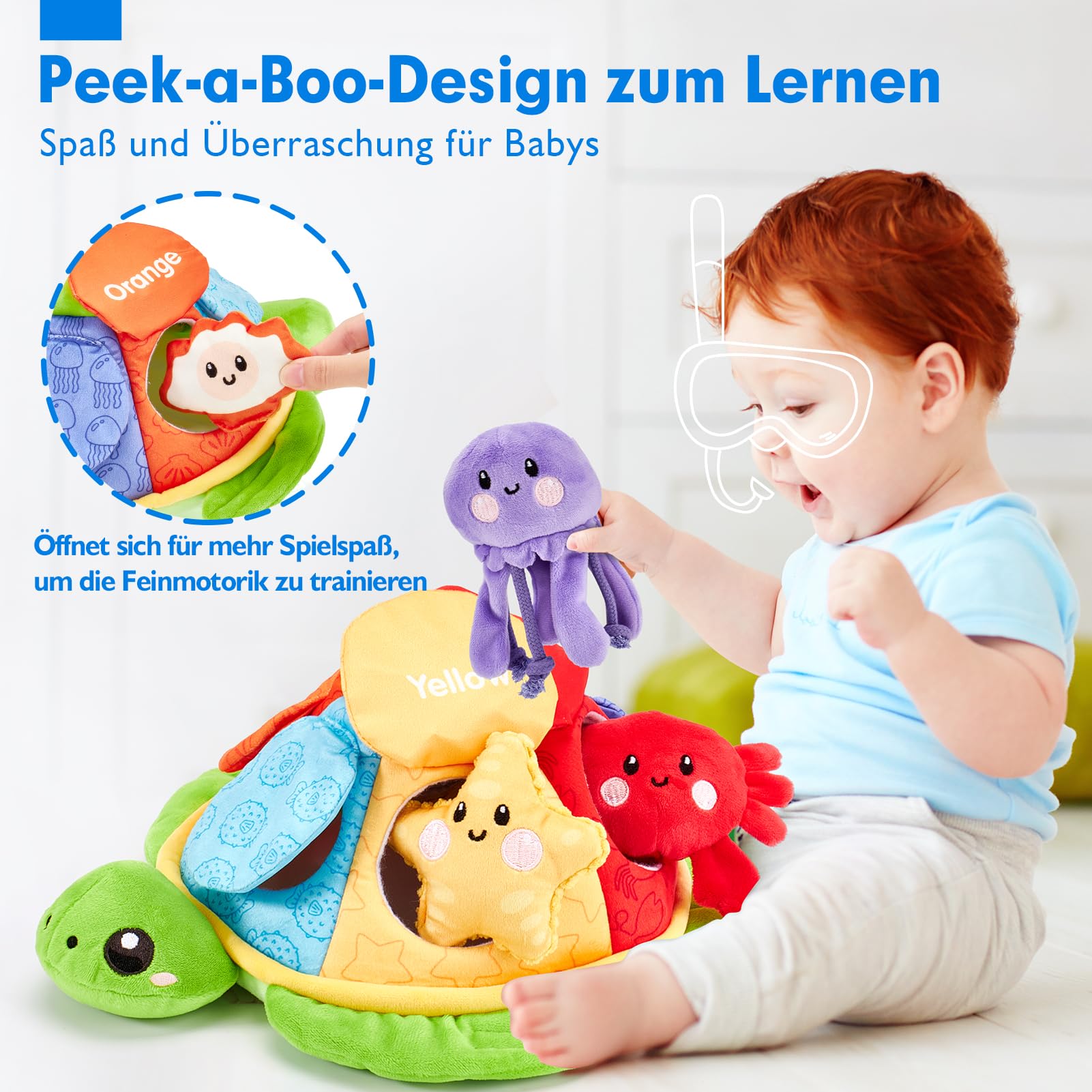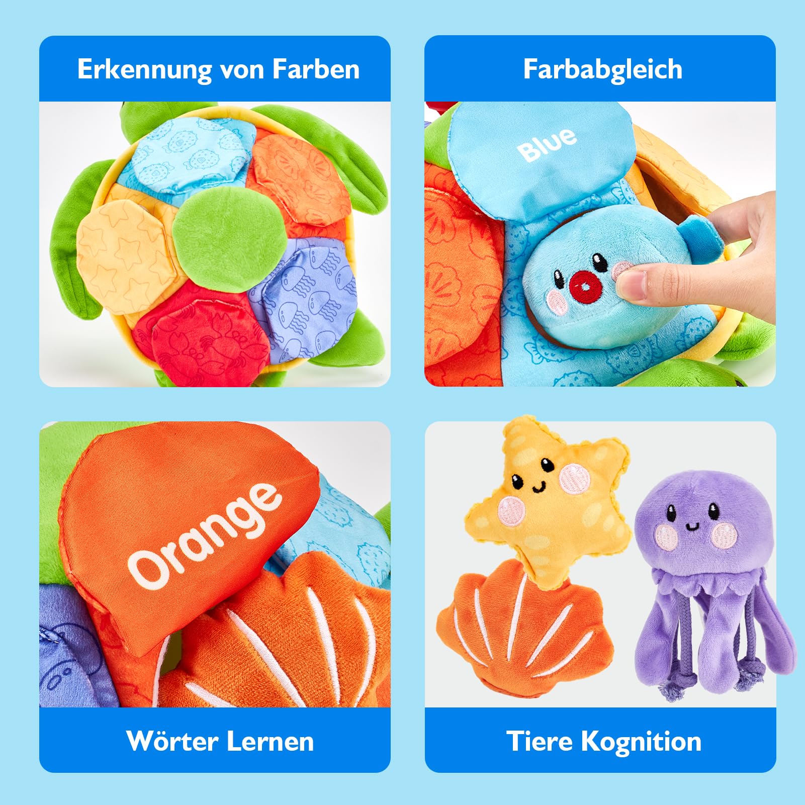 • La tortue et ses cinq amis marins (crabe, poisson-globe, pieuvre, étoile de mer, moule) jouent à cache-cache - un plaisir sans fin. Ce jouet favorise la reconnaissance des créatures marines, des couleurs et des mots, ainsi que le développement de la vue et de l'ouïe.