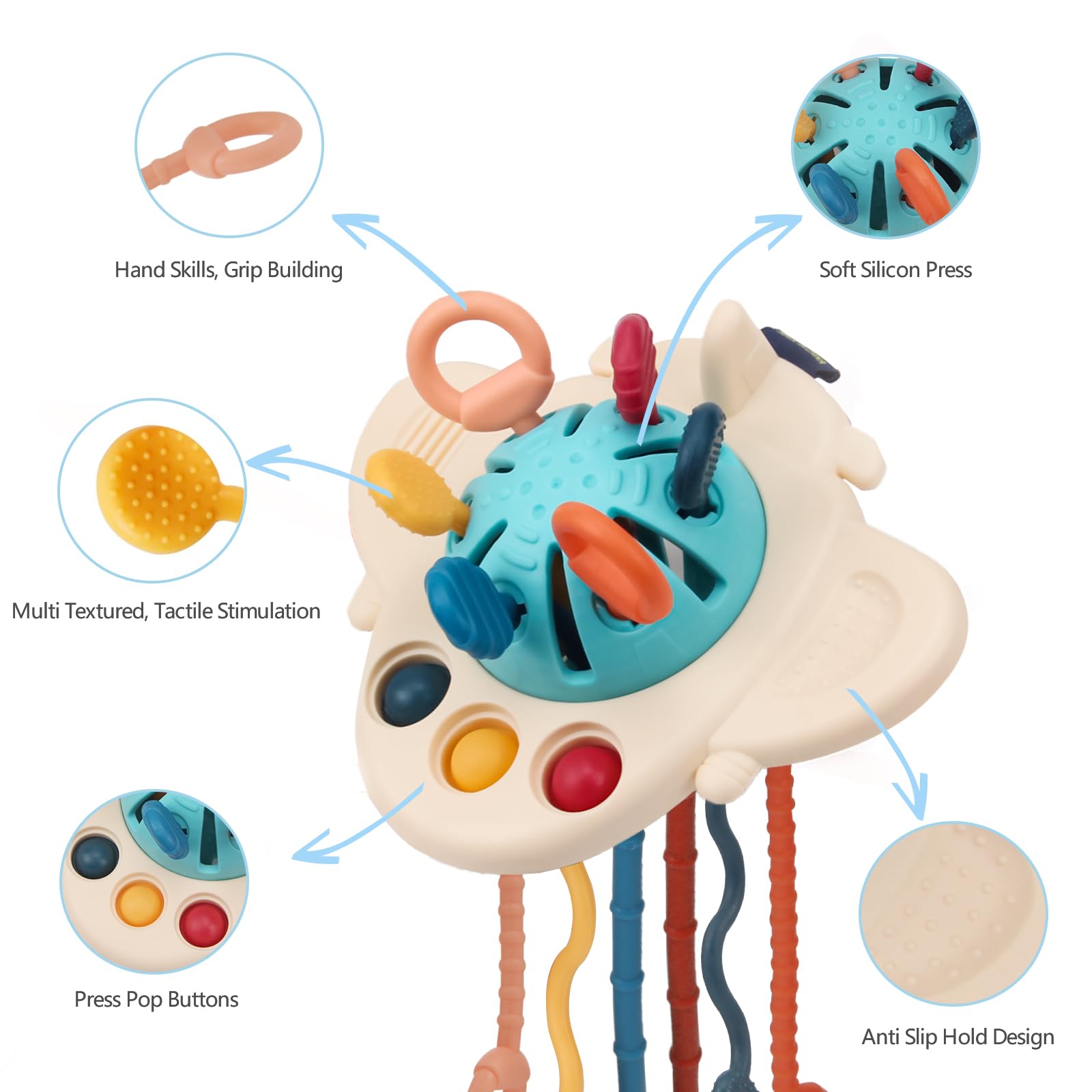 • Le jouet à tirer est fabriqué en silicone de qualité alimentaire et en ABS, sans BPA ni acide phtalique, sûr et non toxique, avec une surface lisse, douce et facile à mâcher, favorisant le développement des dents de lait de bébé.