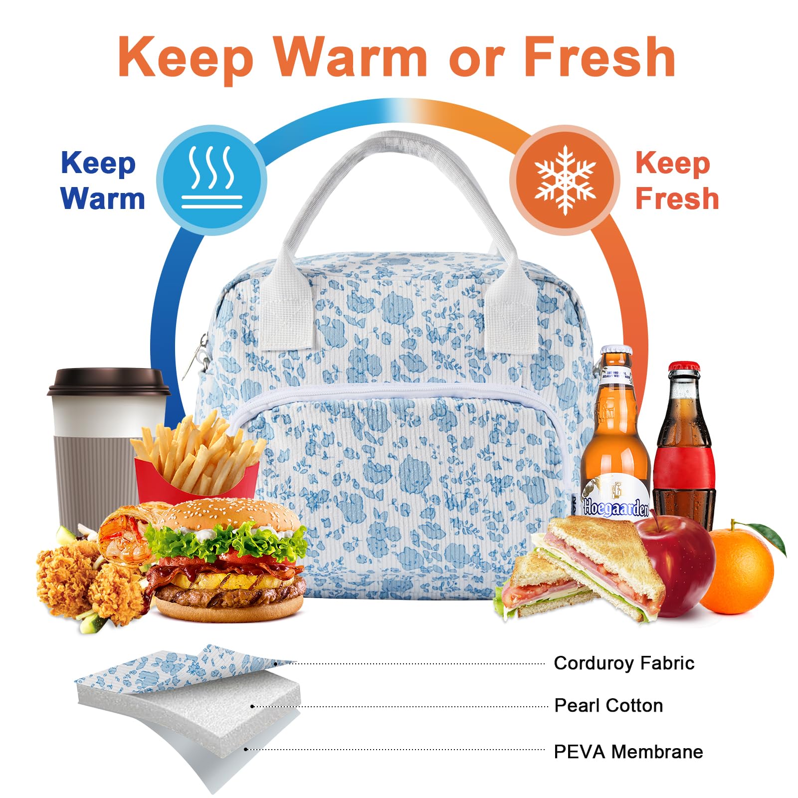 - Matériau de haute qualité-Le sac à lunch isolé est fait de velours côtelé de haute qualité, avec des poignées robustes qui rendent le sac à lunch durable. L'isolation intérieure avec une doublure en PEVA sans danger pour les aliments et une isolation en super mousse garde vos aliments chauds ou froids pendant des heures.